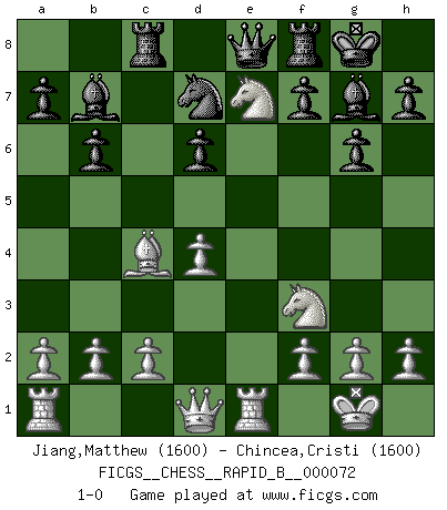 Last move : 1-0 2007 November 14 11:25:17 [Event "FICGS__CHESS__RAPID_B__000072"] [Site "FICGS"] [Date "2007.10.17"] [Round "1"] [White "Jiang,Matthew"] [Black "Chincea,Cristi"] [Result "1-0"] [WhiteElo "1600"] [BlackElo "1600"] 1.e4 d6 2.d4 g6 3.Nc3 Bg7 4.Nf3 Nf6 5.Be2 O-O 6.O-O b6 7.Bg5 Bb7 8.e5 Nfd7 9.exd6 cxd6 10.Bc4 Nc6 11.Re1 Qe8 12.Nd5 Rc8 13.Bxe7 Nxe7 14.Nxe7+ 1-0 King's pawn Opening Kingside Castling by player Black (move 5) Kingside Castling by player White (move 6) Player White won this chess game. Follow this game move after move (download)You can only get good at Chess if you love the game. (Bobby Fischer) Ich kenne Menschen, die allen Willen der Welt besitzen und doch nicht Schach spielen können. (Robert James Fischer) ¿Esta Bobby Fischer algo cuerdo?. (Salo Flohr) Comme les marins qui ont mille raisons différentes d'aller en mer, les joueurs d'échecs en ont tout autant avant de s'installer devant une table et jouer... (Vincent Bertignac, philosophe) The difference between perseverance and obstinacy is that one comes from a strong will, and the other from a strong won't. (Henry Ward Beecher)