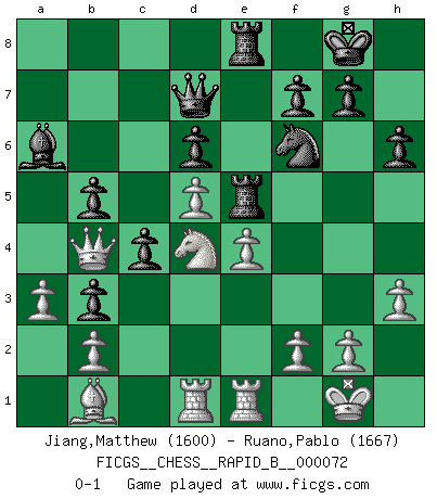 Last move : 0-1 2008 February 25 14:38:16 [Event "FICGS__CHESS__RAPID_B__000072"] [Site "FICGS"] [Date "2007.10.17"] [Round "1"] [White "Jiang,Matthew"] [Black "Ruano,Pablo"] [Result "0-1"] [WhiteElo "1600"] [BlackElo "1667"] 1.e4 e5 2.Nf3 Nc6 3.Bb5 a6 4.Ba4 Nf6 5.O-O Be7 6.Re1 b5 7.Bb3 O-O 8.c3 d6 9.h3 a5 10.d4 a4 11.Bc2 Ba6 12.Bd3 Qd7 13.Bg5 Rfb8 14.Nbd2 exd4 15.cxd4 Nb4 16.Be2 c5 17.Bf4 Re8 18.a3 Nc6 19.d5 Na5 20.Rc1 Bd8 21.Bd3 c4 22.Bb1 Nb3 23.Nxb3 axb3 24.Nd4 Ba5 25.Bd2 Bxd2 26.Qxd2 Re5 27.Rcd1 h6 28.Qb4 Rae8 0-1 This chess game has been lost on time (started : 2007.10.17 16:56:22) Ruy Lopez : Closed, 7...O-O Kingside Castling by player White (move 5) Kingside Castling by player Black (move 7) Player Black won this chess game. Follow this game move after move (download)Chess is a beautiful mistress. (Bent Larsen) Schachspieler können ausgezeichnet Varianten am Schachbrett berechnen, aber nicht im realen Leben. Zu stark ist der Individualismus im Schach ausgeprägt, und für viele ist ein kleiner momentaner persönlicher Vorteil wichtiger als ein weit größerer Vorteil von morgen. (Anatoly Karpov) Los Peones son nacidos libres, y aún así, se encuentran encadenados por todos lados. (Rick Kennedy) Shah mat. Le roi est mort. Cri de fierté d'un joueur venant de terrasser son adversaire, courtoisement, sans effusion de sang. There will be no order, only chaos. (Sol Robeson in Pi by Darren Aronofsky)