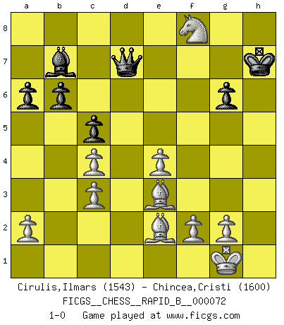 Last move : 1-0 2008 January 12 12:28:50 [Event "FICGS__CHESS__RAPID_B__000072"] [Site "FICGS"] [Date "2007.10.17"] [Round "1"] [White "Cirulis,Ilmars"] [Black "Chincea,Cristi"] [Result "1-0"] [WhiteElo "1543"] [BlackElo "1600"] 1.d4 Nf6 2.c4 g6 3.Nc3 Bg7 4.e4 d6 5.Nf3 O-O 6.Be2 Nbd7 7.O-O Ne8 8.Be3 b6 9.Qc2 Bb7 10.Rad1 Rc8 11.Rfe1 c5 12.d5 Rb8 13.Qa4 Nc7 14.h4 a6 15.h5 e6 16.dxe6 Bxc3 17.bxc3 fxe6 18.Rxd6 Rf7 19.Ng5 Re7 20.hxg6 hxg6 21.Red1 Bc8 22.Qc6 Qe8 23.Qxc7 Rb7 24.Qc6 Kg7 25.Rxe6 Rxe6 26.Nxe6+ Kh7 27.Qxb7 Bxb7 28.Rxd7+ Qxd7 29.Nf8+ 1-0 King's Indian : 6.Be2 Kingside Castling by player Black (move 5) Kingside Castling by player White (move 7) Player White won this chess game. Follow this game move after move (download)Some sacrifices are sound; the rest are mine. (Mikhail Tal) Oft bringt ein stiller Zug das Erdbeben. (Richard Reti) Uno no tiene que jugar muy bien, es suficiente jugar mejor que el oponente. (Siegbert Tarrasch) Un journaliste : 'Vous préférez avoir une dame de plus sur l'échiquier ou au lit ?' Boris Spassky : 'Ca dépend de la position.' Warrior pose battles inner weakness and wins focus. You see that there is no war within you. You're on your own side, and you are your own strength. (Terri Guillemets)