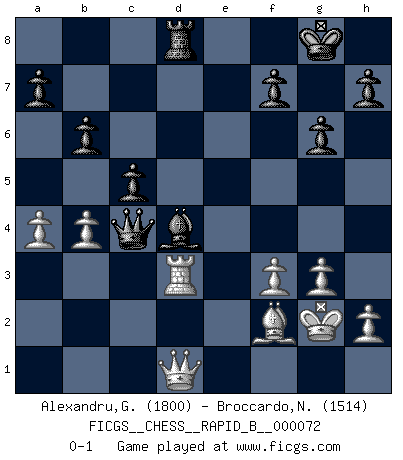 Last move : 0-1 2007 December 25 9:49:4 [Event "FICGS__CHESS__RAPID_B__000072"] [Site "FICGS"] [Date "2007.10.17"] [Round "1"] [White "Alexandru,Ghiura"] [Black "Broccardo,Nicola"] [Result "0-1"] [WhiteElo "1800"] [BlackElo "1514"] 1.d4 Nf6 2.Nf3 d6 3.c4 g6 4.Nc3 Bg7 5.g3 Bg4 6.Bg2 O-O 7.O-O Nc6 8.Be3 Qd7 9.Nd2 Bh3 10.f3 Bxg2 11.Kxg2 d5 12.Bf2 e6 13.Rc1 Rad8 14.cxd5 Nxd5 15.e3 Nxc3 16.Rxc3 e5 17.Nb3 exd4 18.exd4 Rfe8 19.Re1 Rxe1 20.Bxe1 Nxd4 21.Rd3 b6 22.Nxd4 Bxd4 23.b4 c5 24.a4 Qd5 25.Bf2 Qc4 0-1 This chess game has been lost on time (started : 2007.10.17 16:56:22) Queen's pawn game Kingside Castling by player Black (move 6) Kingside Castling by player White (move 7) Player Black won this chess game. Follow this game move after move (download)I have never in my life played the French Defence, which is the dullest of all openings. (Wilhelm Steinitz) Jeder leidlich begabte Spieler, er braucht keineswegs hervorragend veranlagt zu sein, kann es zum Meister bringen. Aber das ist ja auch gar nicht nötig! Der richtige Standpunkt ist es, zu seinem Vergnügen zu spielen, und man glaube ja nicht, dass der Genuss proportional dem Können sei. (Siegbert Tarrasch) Yo nunca en mi vida he jugado la Defensa Francesa, que viene siendo la más aburrida de todas las Aperturas. (Wilhelm Steinitz) Nous sommes les pions de la mystérieuse partie d'Echecs jouée par Dieu. Il nous déplace, nous arrête, nous pousse encore, puis nous lance un à un dans la boîte du Néant. Epitaphe sur la tombe de David Janowsky (1868-1927). Hello Thibault, if I have had a plan (and I had one, I hope), I have forgotten it during the last week... - Hello Heinz-Georg. What do you mean a plan ? (Anonymous players, during a Big Chess game)
