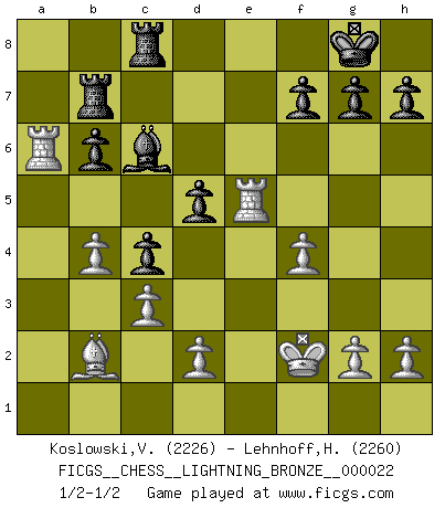 Last move : 1/2-1/2 2007 October 17 21:24:57 [Event "FICGS__CHESS__LIGHTNING_BRONZE__000022"] [Site "FICGS"] [Date "2007.10.17"] [Round "1"] [White "Koslowski,Volker"] [Black "Lehnhoff,Heinz-Georg"] [Result "1/2-1/2"] [WhiteElo "2226"] [BlackElo "2260"] 1.e4 c5 2.Nc3 e6 3.f4 Nc6 4.Nf3 d5 5.Bb5 Nge7 6.exd5 Nxd5 7.O-O Bd7 8.Nxd5 exd5 9.Re1+ Be7 10.Qe2 Bg4 11.b3 O-O 12.Bxc6 Bf6 13.Bxb7 Rb8 14.c3 Rxb7 15.Qf2 Qa5 16.Bb2 c4 17.Nd4 Bd7 18.b4 Qb6 19.a4 Rc8 20.a5 Bxd4 21.axb6 Bxf2+ 22.Kxf2 axb6 23.Re5 Bc6 24.Ra6 Bb5 25.Ra1 Bc6 26.Ra6 1/2-1/2 Sicilian : Closed Kingside Castling by player White (move 7) Kingside Castling by player Black (move 11) This chess game ended in a draw. Follow this game move after move (download)First-class players lose to second-class players because second-class players sometimes play a first-class game. (Siegbert Tarrasch) Schach ist Krieg, im Schach geht es um testosterongesteuerte Urschreie. (Garry Kasparov) En el Ajedrez, cuando menos, el valiente hereda la tierra. (Edmar Mednis) Ce n'est pas pour s'amuser qu'il joue aux échecs : il célèbre un culte. (Vladimir Nabokov) Life is verb, not a noun. (Charlotte Perkins Gilman)