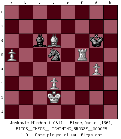 Last move : 1-0 2007 October 18 15:52:45 [Event "FICGS__CHESS__LIGHTNING_BRONZE__000025"] [Site "FICGS"] [Date "2007.10.18"] [Round "1"] [White "Jankovic,Mladen"] [Black "Pipac,Darko"] [Result "1-0"] [WhiteElo "1061"] [BlackElo "1361"] 1.e4 e5 2.f4 Nc6 3.Bc4 Qh4+ 4.g3 Qf6 5.Nf3 Qg6 6.d3 Bc5 7.Nc3 exf4 8.Nd5 Bd6 9.gxf4 Qg2 10.Rg1 Qh3 11.Rxg7 a6 12.e5 Kf8 13.Rg3 Qh6 14.exd6 cxd6 15.Nc7 Rb8 16.Qe2 Nf6 17.f5 Qh5 18.Ng5 h6 19.Nxf7 Qxe2+ 20.Kxe2 Nd4+ 21.Kd1 Nxf5 22.Nxh8 Nxg3 23.hxg3 Kg7 24.Nf7 d5 25.Bxh6+ Kxf7 26.Nxd5 b5 27.Bb3 Kg6 28.Bf4 d6 29.Bxd6 Bg4+ 30.Kd2 Re8 31.Re1 Rd8 32.Be7 Rxd5 33.Bxd5 Nxd5 34.Bd6 Nf6 35.b3 Bf5 36.c4 Ng4 37.cxb5 Nf2 38.Re3 Ng4 39.Rf3 axb5 40.a4 bxa4 41.bxa4 Bd7 42.a5 Bc6 43.Rf4 Nf6 44.g4 Nd5 45.Rf5 1-0 King's gambit 10 pieces endgame at move 40 : White KRBPPP , Black KBNP WHITE : King + 1 Rook 1 Bishop 3 Pawns BLACK : King + 1 Bishop 1 Knight 1 Pawn 9 pieces endgame at move 41 : White KRBPPP , Black KBN WHITE : King + 1 Rook 1 Bishop 3 Pawns BLACK : King + 1 Bishop 1 Knight Player White won this chess game. Follow this game move after move (download)The passed pawn is a criminal, who should be kept under lock and key. Mild measures, such as police surveillance, are not sufficient. (Nimzovitch) Ich verachte Kasparow. (Viktor Kortschnoi) Un Peón pasado es un criminal, quién debe ser mantenido bajo candado y llave. Leves medidas, tales como vigilancia policiaca, no son suficientes. (Aaron Nimzovich) Si je n'étais pas joueur d'échecs, je serais le meilleur dans quelque chose d'autre. (Anatoli Karpov) Good luck. You're gonna need it. (Han Solo in Star Wars ep.6)