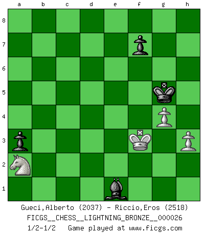 Last move : 1/2-1/2 2007 October 18 20:6:2 [Event "FICGS__CHESS__LIGHTNING_BRONZE__000026"] [Site "FICGS"] [Date "2007.10.18"] [Round "1"] [White "Gueci,Alberto"] [Black "Riccio,Eros"] [Result "1/2-1/2"] [WhiteElo "2037"] [BlackElo "2518"] 1.e4 e5 2.Nf3 Nc6 3.Bb5 a6 4.Ba4 Nf6 5.O-O Be7 6.Re1 b5 7.Bb3 d6 8.c3 O-O 9.h3 Bb7 10.d4 Re8 11.a4 h6 12.Nbd2 Bf8 13.d5 Nb8 14.c4 bxc4 15.Bxc4 c6 16.dxc6 Bxc6 17.b4 d5 18.exd5 Bxd5 19.Bb2 Bxb4 20.Rxe5 Bxc4 21.Rxe8+ Qxe8 22.Nxc4 Nbd7 23.Nce5 Nc5 24.Qd4 a5 25.Ng4 Nce4 26.Nxf6+ Nxf6 27.Rc1 Qxa4 28.Qc4 Qd7 29.Bxf6 gxf6 30.Qf4 Rc8 31.Rxc8+ Qxc8 32.Qxh6 Bd6 33.Nh2 Qf5 34.Qh4 Qf4 35.Qg4+ Qxg4 36.Nxg4 Kg7 37.Ne3 a4 38.Nd5 a3 39.Nc3 f5 40.Kf1 Kg6 41.Ke2 f4 42.Kd3 f3 43.g3 Bb4 44.Kd4 Ba5 45.Na2 Bb6+ 46.Ke4 Bxf2 47.Kxf3 Be1 48.g4 Kg5 1/2-1/2 Ruy Lopez : Closed Kingside Castling by player White (move 5) Kingside Castling by player Black (move 8) 10 pieces endgame at move 36 : White KNPPP , Black KBPPP WHITE : King + 1 Knight 3 Pawns BLACK : King + 1 Bishop 3 Pawns 9 pieces endgame at move 46 : White KNPP , Black KBPPP WHITE : King + 1 Knight 2 Pawns BLACK : King + 1 Bishop 3 Pawns 8 pieces endgame at move 47 : White KNPP , Black KBPP WHITE : King + 1 Knight 2 Pawns BLACK : King + 1 Bishop 2 Pawns This chess game ended in a draw. Follow this game move after move (download)The combination player thinks forward; he starts from the given position, and tries the forceful moves in his mind. (Emanuel Lasker) Verschiedene, sehr schätzbare und im Laufe des Lebens nützliche Eigenschaften des Geistes können durch das Schachspiel erworben und gekräftigt werden, so dass sie zu Gewohnheiten werden, die uns nie im Stich lassen. (Benjamin Franklin) Cuando tu no sabes absolutamente que mas hacer, es tiempo de entrar en pánico. (John van der Wiel) J'apprécie les joueurs d'est-indienne, c'est grâce à eux que je nourris ma famille depuis tant d'années. (Petrosian) Before all elsed, be armed. (Niccolo Machiavelli)