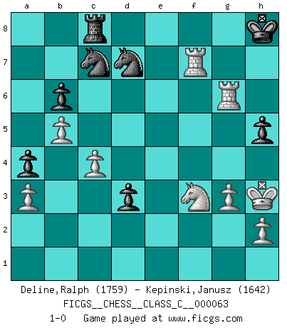 Last move : 1-0 2007 December 7 12:47:19 [Event "FICGS__CHESS__CLASS_C__000063"] [Site "FICGS"] [Date "2007.10.18"] [Round "1"] [White "Deline,Ralph"] [Black "Kepinski,Janusz"] [Result "1-0"] [WhiteElo "1759"] [BlackElo "1642"] 1.Nf3 c5 2.c4 Nf6 3.Nc3 e6 4.g3 b6 5.Bg2 Bb7 6.O-O Be7 7.Re1 O-O 8.e4 d6 9.d4 cxd4 10.Nxd4 Qc8 11.b3 a6 12.Bb2 Nbd7 13.f4 Nc5 14.Qe2 Qc7 15.Rad1 Rad8 16.b4 Ncd7 17.e5 dxe5 18.fxe5 Ne8 19.Bxb7 Qxb7 20.a3 Nc7 21.Qg2 Qxg2+ 22.Kxg2 Nb8 23.Ne4 h5 24.Bc1 a5 25.b5 Na8 26.Bg5 Bxg5 27.Nxg5 Rc8 28.Rf1 g6 29.Kh3 a4 30.Rf4 Nc7 31.Rdf1 f5 32.exf6 e5 33.f7+ Kh8 34.Rf6 exd4 35.Rxg6 Nd7 36.Rf5 d3 37.Nf3 Rxf7 38.Rxf7 1-0 Reti Opening Kingside Castling by player White (move 6) Kingside Castling by player Black (move 7) Player White won this chess game. Follow this game move after move (download)Many have become Chess Masters, no one has become the Master of Chess. (Siegbert Tarrasch) Mein Name ist Rustam Kamsky. Sie haben meinen Sohn belästigt. Bereiten Sie sich aufs Sterben vor. (Rustam Kamsky) Nunca antes ha habido un jugador de Ajedrez con tal conocimiento a fondo de las complejidades del juego y una inmensa voluntad absolutamente indomable de ganar. Yo pienso que Fischer es el jugador mas grande que jamás haya existido. (Lisa Lane) D'abord les bases : Jouez et étudiez, puis étudiez et jouez, ensuite jouez et étudiez, puis étudiez et jouez. Deuxièmement : Donnez toujours le meilleur de vous-même ! (Ken Smith) All politicians must be presumed guilty until they are proven innocent. (Dinesh De Silva)