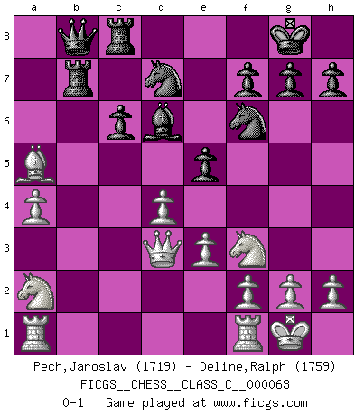Last move : 0-1 2008 January 23 13:54:17 [Event "FICGS__CHESS__CLASS_C__000063"] [Site "FICGS"] [Date "2007.10.18"] [Round "1"] [White "Pech,Jaroslav"] [Black "Deline,Ralph"] [Result "0-1"] [WhiteElo "1719"] [BlackElo "1759"] 1.d4 d5 2.c4 c6 3.Nf3 Nf6 4.Nc3 dxc4 5.a4 Bf5 6.e3 Nbd7 7.Bxc4 e6 8.O-O Bb4 9.Qb3 a5 10.Na2 Bd6 11.Qxb7 Rb8 12.Qa6 O-O 13.Bd2 Rxb2 14.Bxa5 Qb8 15.Be2 Rb7 16.Qc4 Rc8 17.Bd3 Bxd3 18.Qxd3 e5 0-1 This chess game has been lost on time (started : 2007.10.18 23:31:31) QGD Slav : Dutch variation Kingside Castling by player White (move 8) Kingside Castling by player Black (move 12) Player Black won this chess game. Follow this game move after move (download)If one piece is badly posted, the whole game is bad. (Tarrasch) Frage: Wie viele Autos haben Sie schon zerstört? - Antwort: Nur zwei. (Loek van Wely) El Rey es una pieza de pelea. ¡Usenlo!. (Wilhelm Steinitz) Les Echecs sont affaire de jugement sensible. Savoir quand frapper et quand esquiver. (Fischer) If things go wrong, don't go with them. (Roger Babson)