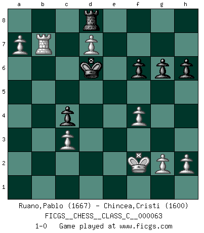 Last move : 1-0 2008 March 19 9:7:10 [Event "FICGS__CHESS__CLASS_C__000063"] [Site "FICGS"] [Date "2007.10.18"] [Round "1"] [White "Ruano,Pablo"] [Black "Chincea,Cristi"] [Result "1-0"] [WhiteElo "1667"] [BlackElo "1600"] 1.e4 c5 2.Nf3 Nc6 3.d4 cxd4 4.Nxd4 d6 5.Nc3 Nf6 6.Bb5 Bd7 7.O-O g6 8.Re1 Bg7 9.Nf3 O-O 10.Nd5 Nxd5 11.exd5 Ne5 12.Bxd7 Nxd7 13.Bg5 Re8 14.c3 Nb6 15.Qb3 Rc8 16.Re2 Qc7 17.Rae1 f6 18.Be3 Nc4 19.Nd4 Qc5 20.Qxb7 Rc7 21.b4 Rxb7 22.bxc5 dxc5 23.Ne6 Nxe3 24.Rxe3 Rc8 25.Nxg7 Kxg7 26.Rxe7+ Rxe7 27.Rxe7+ Kh6 28.Rxa7 c4 29.d6 Rd8 30.d7 Kg7 31.a4 Kf7 32.a5 Ke6 33.a6 Kd6 34.Rb7 Kc6 35.f4 h6 36.Kf2 Kd6 37.a7 1-0 Sicilian defense Kingside Castling by player White (move 7) Kingside Castling by player Black (move 9) Player White won this chess game. Follow this game move after move (download)Half the variations which are calculated in a tournament game turn out to be completely superfluous. Unfortunately, no one knows in advance which half. (Jan Tinman) Wenn Du absolut nicht mehr weißt, was Du tun sollst, dann ist es Zeit für Panik. (John van der Wiel) ¿Porque tengo que perder ante este idiota?. (Aron Nimzovich) Le pion, dans sa simplicité, marche droit devant lui, mais lorsqu'il prend, il le fait obliquement? Ainsi l'homme, tant qu'il reste pauvre, marche dans la droiture et vit honnêtement, mais lorsqu'il recherche les honneurs, il flatte, se parjure et, par les voies obliques, cherche une position supérieure sur l'échiquier du monde. (Jean de Galles) We're missing something. (Gregory House, House M.D.)