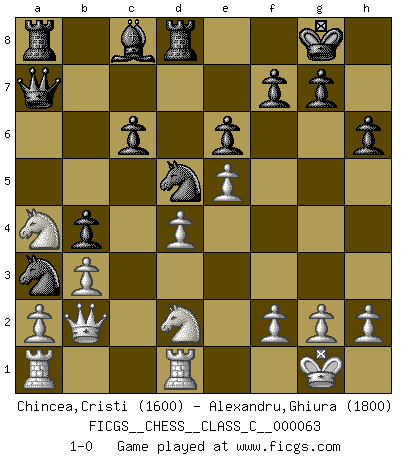 Last move : 1-0 2008 January 22 11:36:38 [Event "FICGS__CHESS__CLASS_C__000063"] [Site "FICGS"] [Date "2007.10.18"] [Round "1"] [White "Chincea,Cristi"] [Black "Alexandru,Ghiura"] [Result "1-0"] [WhiteElo "1600"] [BlackElo "1800"] 1.d4 d5 2.c4 c6 3.Nf3 Nf6 4.Nc3 e6 5.Bg5 Nbd7 6.e3 Be7 7.Be2 O-O 8.O-O dxc4 9.Bxc4 b5 10.Bb3 a5 11.Re1 h6 12.Bh4 Nd5 13.Bxe7 Qxe7 14.e4 N5b6 15.Re2 a4 16.Rd2 axb3 17.Qxb3 Nf6 18.Qc2 Nc4 19.R2d1 Rd8 20.b3 Na3 21.Qb2 b4 22.e5 Nd5 23.Na4 Qa7 24.Nd2 1-0 QGD Slav : 4.Nc3 Kingside Castling by player Black (move 7) Kingside Castling by player White (move 8) Player White won this chess game. Follow this game move after move (download)Life is a kind of Chess, with struggle, competition, good and ill events. (Benjamin Franklin) Man gibt nur Pakete auf. (Paul Keres) Alekhine es un poeta que crea un trabajo de arte de algo que raramente inspiraría a otra persona a mandar una tarjeta postal. (Max Euwe) Donnez-moi un Cavalier en 6e et je gagnerais toutes mes parties. (Steinitz) Gambling is the son of avarice and the father of despair. (French proverb)