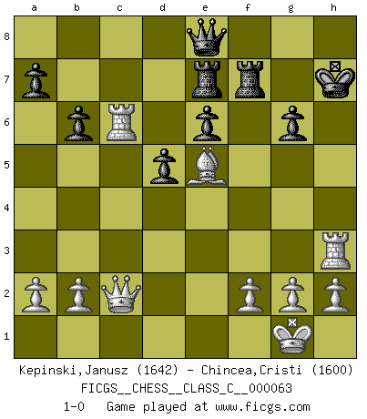 Last move : 1-0 2007 December 10 13:57:34 [Event "FICGS__CHESS__CLASS_C__000063"] [Site "FICGS"] [Date "2007.10.18"] [Round "1"] [White "Kepinski,Janusz"] [Black "Chincea,Cristi"] [Result "1-0"] [WhiteElo "1642"] [BlackElo "1600"] 1.d4 Nf6 2.c4 g6 3.Nc3 Bg7 4.e4 O-O 5.Nf3 b6 6.Bd3 Bb7 7.e5 Ne8 8.O-O d6 9.e6 fxe6 10.Ng5 Qd7 11.d5 exd5 12.cxd5 Nf6 13.Ne6 Rf7 14.Re1 Nxd5 15.Bxg6 hxg6 16.Nxd5 Bxd5 17.Qxd5 Nc6 18.Nxg7 Kxg7 19.Bh6+ Kg8 20.Rac1 Re8 21.Rxc6 e6 22.Qc4 d5 23.Qc2 Kh7 24.Bf4 Kg8 25.Bxc7 R8e7 26.Be5 Kh7 27.Re3 Qe8 28.Rh3+ 1-0 King's Indian : 4.e4 Kingside Castling by player Black (move 4) Kingside Castling by player White (move 8) Player White won this chess game. Follow this game move after move (download)Bobby Fischer is the greatest Chess player who has ever lived. (Ken Smith) Das Schachspiel hat wie die Liebe, die Musik, die Fähigkeit, den Menschen glücklich zu machen. Ich habe ein leises Gefühl des Bedauerns für jeden, der das Schachspiel nicht kennt, so wie ich jeden bedaure, der die Liebe nicht kennt. (Siegbert Tarrasch) El Ajedrez es una manera fabulosa para que los niños aprendan a autovalorarse y a autoestimarse. (Saudin Robovic) Même un GMI sait rarement calculer sur plus de cinq coups une attaque à sacrifices. (Rudolf Spielmann) A good book on your shelf is a friend that turns its back on you and remains a friend. (Author unknown)