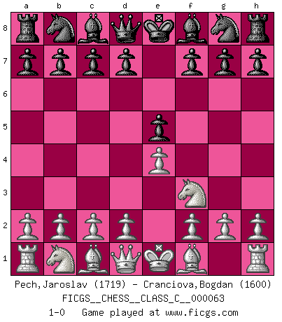Last move : 1-0 2007 December 3 8:11:11 [Event "FICGS__CHESS__CLASS_C__000063"] [Site "FICGS"] [Date "2007.10.18"] [Round "1"] [White "Pech,Jaroslav"] [Black "Cranciova,Bogdan"] [Result "1-0"] [WhiteElo "1719"] [BlackElo "1600"] 1.e4 e5 2.Nf3 1-0 This chess game has been lost on time (started : 2007.10.18 23:31:31) King's knight Opening Player White won this chess game. Follow this game move after move (download)Good positions don't win games, good moves do. (Gerald Abrahams) Die meiste Zeit treffe ich auf Gegner, die meine Enkel sein könnten. Ich bin da, um ihnen zu zeigen, dass sie von mir noch einiges lernen können. (Viktor Kortschnoi) Nos gusta pensar. (Gary Kasparov) Il vaut mieux sacrifier les pièces de l'adversaire. (Xavier Tartacover) I would love to change the world, but they won't give me the source code. (Unknown)