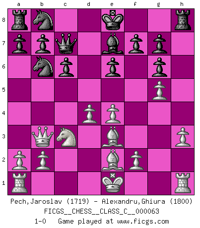 Last move : 1-0 2008 February 6 12:44:43 [Event "FICGS__CHESS__CLASS_C__000063"] [Site "FICGS"] [Date "2007.10.18"] [Round "1"] [White "Pech,Jaroslav"] [Black "Alexandru,Ghiura"] [Result "1-0"] [WhiteElo "1719"] [BlackElo "1800"] 1.d4 d5 2.c4 c6 3.Nf3 Nf6 4.Nc3 Bf5 5.e3 e6 6.Nh4 Bg4 7.Qb3 Qc7 8.h3 Bh5 9.g4 Bg6 10.Nxg6 hxg6 11.g5 dxc4 12.Bxc4 Nd5 13.e4 Nb6 14.Be2 Be7 15.Be3 1-0 QGD Slav : 4.Nc3 Player White won this chess game. Follow this game move after move (download)If your opponent cannot do anything active, then don't rush the position; instead you should let him sit there, suffer, and beg you for a draw. (Jeremy Silman) Meine Liebe ist Schach, Schach, Schach. Ich muss jeden Tag Schach spielen, deshalb fühle ich mich so stark. (Miguel Najdorf) Aquel que toma al Peón de Caballo de la Reina, se pasará la noche a dormir en la calle. (Anónimo) J'apprécie les joueurs d'est-indienne, c'est grâce à eux que je nourris ma famille depuis tant d'années. (Petrosian) There are more things in heaven and earth than practically anywhere else. (Unknown)