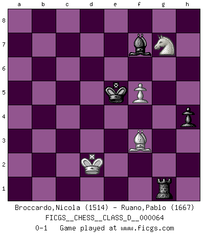 Last move : 0-1 2008 September 8 8:59:55 [Event "FICGS__CHESS__CLASS_D__000064"] [Site "FICGS"] [Date "2007.10.19"] [Round "1"] [White "Broccardo,Nicola"] [Black "Ruano,Pablo"] [Result "0-1"] [WhiteElo "1514"] [BlackElo "1667"] 1.c4 e5 2.Nc3 Nf6 3.Nf3 Nc6 4.g3 Bb4 5.Bg2 d5 6.cxd5 Nxd5 7.O-O Be6 8.Nxd5 Bxd5 9.d3 O-O 10.a3 Be7 11.e4 Be6 12.Be3 Bf6 13.Qd2 a6 14.Rac1 Qd7 15.Rc3 Rfe8 16.Rfc1 Red8 17.Ng5 Bg4 18.Nf3 Bh3 19.Bh1 Qg4 20.Qd1 Qg6 21.Qd2 Bg4 22.Bg2 Qh5 23.Rxc6 bxc6 24.Ne1 Be7 25.Rxc6 Bd6 26.Qa5 Bd7 27.Rxa6 Rxa6 28.Qxa6 Qe2 29.Qa5 Qxb2 30.Bc5 Qb5 31.Qxb5 Bxb5 32.Bxd6 cxd6 33.f4 Ra8 34.Kf2 Rxa3 35.Bf1 exf4 36.gxf4 Ra2+ 37.Be2 f5 38.exf5 d5 39.h4 Kf8 40.Ke3 d4+ 41.Kf2 Kf7 42.Nf3 Kf6 43.Nxd4 Bxd3 44.Kf3 Bb1 45.Nb5 Bxf5 46.Ke3 Rb2 47.Nd4 Bg6 48.Bg4 Ra2 49.f5 h5 50.Be2 Be8 51.Kf4 Ra4 52.Ke3 Ke5 53.Ne6 Rxh4 54.Nxg7 Rh3+ 55.Kd2 Bf7 56.Bf1 Rh1 57.Be2 h4 58.Bf3 Rg1 0-1 English Opening Kingside Castling by player White (move 7) Kingside Castling by player Black (move 9) 10 pieces endgame at move 45 : White KBNPP , Black KRBPP WHITE : King + 1 Bishop 1 Knight 2 Pawns BLACK : King + 1 Rook 1 Bishop 2 Pawns 9 pieces endgame at move 53 : White KBNP , Black KRBPP WHITE : King + 1 Bishop 1 Knight 1 Pawn BLACK : King + 1 Rook 1 Bishop 2 Pawns 8 pieces endgame at move 54 : White KBNP , Black KRBP WHITE : King + 1 Bishop 1 Knight 1 Pawn BLACK : King + 1 Rook 1 Bishop 1 Pawn Player Black won this chess game. Follow this game move after move (download)Alekhine is a poet who creates a work of art out of something that would hardly inspire another man to send home a picture post card. (Max Euwe) Um dein Spiel zu verbessern musst du zuallererst das Endspiel studieren, denn diese kann unabhängig studiert werden. Die Eröffnung und das Mittelspiel müssen immer in Bezug gesetzt werden zum Endspiel. (José Raúl Capablanca) El Ajedrez, como la música, como el amor, tiene el poder de hacer feliz a la gente. (Siegbert Tarrasch) La tactique est l'élément le plus important du milieu de jeu. (Siegbert Tarrasch) Do you know these so called Volunteers don't even get paid! (Simpsons)