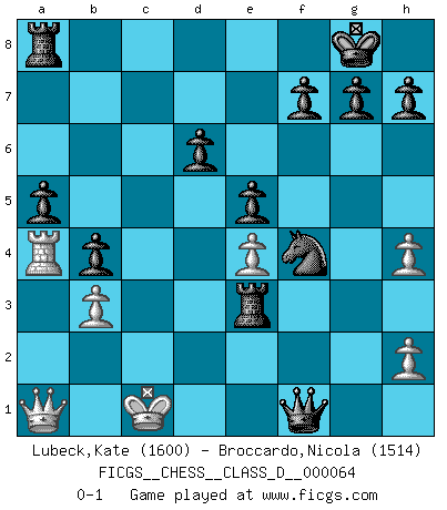 Last move : 0-1 2007 November 13 23:33:55 [Event "FICGS__CHESS__CLASS_D__000064"] [Site "FICGS"] [Date "2007.10.19"] [Round "1"] [White "Lubeck,Kate"] [Black "Broccardo,Nicola"] [Result "0-1"] [WhiteElo "1600"] [BlackElo "1514"] 1.e4 d6 2.Bb5+ c6 3.Bc4 Nf6 4.f3 b5 5.Be2 e5 6.Nh3 Bxh3 7.gxh3 Be7 8.Nc3 Qd7 9.Bf1 b4 10.Na4 Nh5 11.d3 Bh4+ 12.Ke2 c5 13.Rg1 Qxa4 14.b3 Qd7 15.Rg4 Bd8 16.Rg5 Bxg5 17.Bxg5 Nc6 18.a3 O-O 19.axb4 cxb4 20.Ra6 Nd4+ 21.Ke1 Rfc8 22.Be3 Nxc2+ 23.Kd2 Nxe3 24.Kxe3 Rc6 25.Ra4 Nf4 26.h4 a5 27.Qa1 Qa7+ 28.d4 Rc3+ 29.Kd2 Qxd4+ 30.Ke1 Qe3+ 31.Kd1 Qxf3+ 32.Ke1 Re3+ 33.Kd2 Qf2+ 34.Be2 Qxe2+ 35.Kc1 Qf1+ 0-1 King's pawn Opening Kingside Castling by player Black (move 18) Player Black won this chess game. Follow this game move after move (download)The tactician knows what to do when there is something to do; whereas the strategian knows what to do when there is nothing to do. (Gerald Abrahams) Gewöhnliche Menschen denken nur daran, wie sie ihre Zeit verbringen. Ein intelligenter Mensch versucht, sie auszunutzen. (Arthur Schopenhauer) ¿Se han dado cuenta de que Fischer casi nunca ha tenido piezas malas? El las intercambia y las piezas malas se quedan con sus oponenets. (Yuri Balashov) Votre seul travail dans les ouvertures est d'obtenir un milieu de partie jouable. (Lajos Portish) Unless in communicating with it one says exactly what one means, trouble is bound to result. (Alan Turing, about computers)