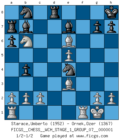 Last move : 1/2-1/2 2006 July 9 11:3:31 [Event "FICGS__CHESS__WCH_STAGE_1_GROUP_07__000001"] [Site "FICGS"] [Date "2006.07.01"] [Round "1"] [White "Starace,Umberto"] [Black "Ornek,Ozer"] [Result "1/2-1/2"] [WhiteElo "1952"] [BlackElo "1367"] 1.e4 c5 2.Nf3 d6 3.d4 cxd4 4.Nxd4 Nf6 5.Nc3 a6 6.Bc4 e6 7.O-O Be7 8.Be3 O-O 9.f4 b5 10.Bb3 b4 11.Na4 Bb7 12.Nxe6 fxe6 13.Bxe6+ Kh8 14.e5 dxe5 15.Qxd8 Rxd8 16.fxe5 Ne4 17.Nb6 Ra7 1/2-1/2 Sicilian : Najdorf, Lipnitzky attack Kingside Castling by player White (move 7) Kingside Castling by player Black (move 8) This chess game ended in a draw. Follow this game move after move (download)After black's reply to 1.e4 with 1..e5, leaves him always trying to get into the game. (Howard Staunton) Der beste Spieler in einem Turnier gewinnt es nie. Er landet auf Platz zwei oder drei. (Siegbert Tarrasch) El Ajedrez tiene tanto misterio como las mujeres. (Purdy) Les échecs, c'est l'imagination. (David Bronstein) Memory is a crazy woman that hoards colored rags and throws away food. (Austin O'Malley)
