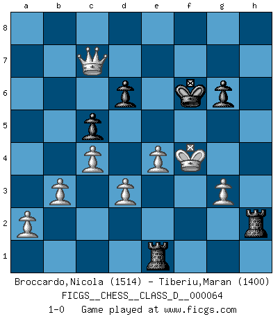 Last move : 1-0 2007 October 31 10:54:55 [Event "FICGS__CHESS__CLASS_D__000064"] [Site "FICGS"] [Date "2007.10.19"] [Round "1"] [White "Broccardo,Nicola"] [Black "Tiberiu,Maran"] [Result "1-0"] [WhiteElo "1514"] [BlackElo "1400"] 1.c4 d6 2.Nc3 g6 3.Nf3 Bg7 4.g3 Nc6 5.Bg2 e5 6.d3 Nf6 7.O-O O-O 8.Bg5 Be6 9.Ne4 h6 10.Nxf6+ Bxf6 11.Bxh6 Re8 12.Qd2 Bg7 13.Bxg7 Kxg7 14.Ng5 Qf6 15.Nxe6+ Qxe6 16.Bxc6 bxc6 17.e4 c5 18.b3 Rh8 19.f4 exf4 20.Rxf4 Rh5 21.Raf1 Rah8 22.Rxf7+ Qxf7 23.Rxf7+ Kxf7 24.Qa5 Rxh2 25.Qxa7 Rh1+ 26.Kf2 R8h2+ 27.Ke3 Kf6 28.Qxc7 Re1+ 29.Kf4 1-0 English Opening Kingside Castling by player White (move 7) Kingside Castling by player Black (move 7) Player White won this chess game. Follow this game move after move (download)Some part of a mistake is always correct. (Savielly Tartakover) Die Fehler sind da, Sie warten nur darauf gemacht zu werden. (Savielly Grigorievitsch Tartakower) El Ajedrez es parte de la cultura, y si una cultura esta en decadencia, entonces también el Ajedrez declinará. (Mikhail Botvinnik) Les Echecs sont et restent toujours un combat, un combat intégral comme la boxe, la lutte ou un autre sport, et où il doit y avoir un vainqueur et un vaincu. (Joseph Emil Diemer) Question: Is 'This statement is paradoxical' a paradoxical statement ? Or is it a meta-paradox ? (Normajean Yates)