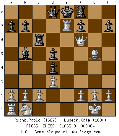 Last move : 1-0 2007 December 5 18:36:9 [Event "FICGS__CHESS__CLASS_D__000064"] [Site "FICGS"] [Date "2007.10.19"] [Round "1"] [White "Ruano,Pablo"] [Black "Lubeck,Kate"] [Result "1-0"] [WhiteElo "1667"] [BlackElo "1600"] 1.e4 e5 2.Nf3 Nc6 3.Bb5 Nd4 4.Nxd4 exd4 5.O-O c6 6.Bc4 d5 7.exd5 cxd5 8.Bb5+ Bd7 9.Re1+ Be7 10.Qg4 Nf6 11.Qxg7 Rf8 12.Qxf6 Bxb5 13.d3 Rc8 14.Bg5 Rc6 15.Rxe7+ 1-0 Ruy Lopez : Bird's defense Kingside Castling by player White (move 5) Player White won this chess game. Follow this game move after move (download)Chess is thirty to forty percent psychology. You don't have this when you play a computer. I can't confuse it. (Judith Polgar) Es gibt nur zwei wahre Schachgenies - das andere war Wilhelm Steinitz, der Weltmeister von 1872 bis 1894. (Robert James Fischer) Fischer era un maestro de claridad y un Rey del posicionamiento astuto. Sus oponentes podían ver hacia donde se dirigía pero eran impotentes para detenerlo. (Bruce Pandolfini) Il n'y a pas de prix trop élevé au scalp de l'ennemi. (Koblentz) He is a liar. I just don't know what the lie is yet. (Horatio Caine, C.S.I. Miami)