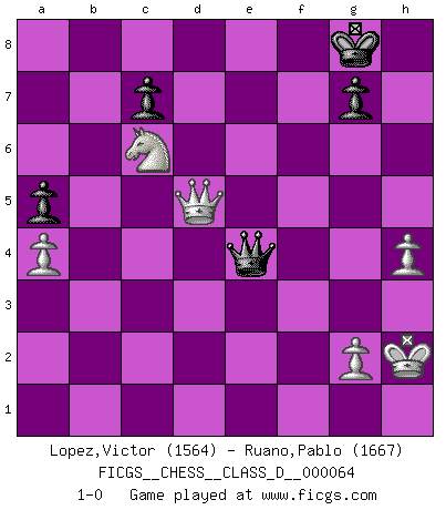 Last move : 1-0 2008 April 19 11:55:4 [Event "FICGS__CHESS__CLASS_D__000064"] [Site "FICGS"] [Date "2007.10.19"] [Round "1"] [White "Lopez,Victor"] [Black "Ruano,Pablo"] [Result "1-0"] [WhiteElo "1564"] [BlackElo "1667"] 1.e4 e5 2.Bc4 Nf6 3.d4 exd4 4.Nf3 Nc6 5.e5 d5 6.Bb5 Ne4 7.Nxd4 Bd7 8.Bxc6 bxc6 9.O-O Bc5 10.f3 Ng5 11.Be3 Ne6 12.f4 O-O 13.f5 Nxd4 14.Bxd4 Bxd4+ 15.Qxd4 Qg5 16.h4 Qh5 17.Rf4 Rfe8 18.Nd2 Qe2 19.Nf3 Qxc2 20.e6 fxe6 21.Rg4 Re7 22.f6 e5 23.Nxe5 Bxg4 24.Qxg4 Qxb2 25.Re1 Qc3 26.Re2 h5 27.Qg5 Qa1+ 28.Kh2 Qf1 29.fxe7 Qxe2 30.Qf5 a5 31.e8Q+ Rxe8 32.Qf7+ Kh7 33.Qg6+ Kh8 34.Qxe8+ Kh7 35.Qg6+ Kg8 36.Qe6+ Kh7 37.Qf5+ Kg8 38.a4 Qe3 39.Qf7+ Kh7 40.Nxc6 Qe4 41.Qxh5+ Kg8 42.Qxd5+ 1-0 Bishop's Opening : Urusov gambit Kingside Castling by player White (move 9) Kingside Castling by player Black (move 12) Promotion Queen by player White (move 31) Player White won this chess game. Follow this game move after move (download)You need not play well - just help your opponent to play badly. (Genrikh Chepukaitis) Smyslow ist ein Beweis dafür, dass ich noch zehn Jahre spielen kann! [der 75 jährige über den 85 jährigen] (Viktor Kortschnoi) El Ajedrez detiene a su maestro dentro de sus propios vínculos, encadenando la mente y el cerebro, por lo que la libertad interior del mas fuerte debe sufrir. (Albert Einstein) Les Echecs, c'est l'art de la guerre sans les charniers, c'est la résurrection des morts tombés au champ d'honneur, l'espoir perpétuel, la suprématie de l'intelligence sur la force, la culture de l'esprit. (F. Szpiner) The arrogant army will lose certainly the battle. (Chinese proverb)