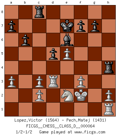 Last move : 1/2-1/2 2008 May 13 1:55:6 [Event "FICGS__CHESS__CLASS_D__000064"] [Site "FICGS"] [Date "2007.10.19"] [Round "1"] [White "Lopez,Victor"] [Black "Pech,Matej"] [Result "1/2-1/2"] [WhiteElo "1564"] [BlackElo "1431"] 1.e4 e6 2.d4 d5 3.exd5 exd5 4.Nc3 Bb4 5.Bd3 Nc6 6.a3 Bxc3+ 7.bxc3 Nf6 8.Ne2 O-O 9.O-O Na5 10.Ng3 Nc4 11.Re1 Bg4 12.f3 Be6 13.Bf4 b6 14.Be5 Re8 15.Qc1 h6 16.Qf4 Nxe5 17.dxe5 Nd7 18.Bb5 c6 19.Bxc6 Rc8 20.Bxd7 Qxd7 21.Nh5 Qe7 22.Re3 Rc4 23.Qg3 Qg5 24.Qxg5 hxg5 25.Ng3 g4 26.Ne2 gxf3 27.gxf3 Rec8 28.Rd3 Kf8 29.Kf2 Ke7 30.Rb1 Rh4 31.Rh1 1/2-1/2 French : Exchange variation Kingside Castling by player Black (move 8) Kingside Castling by player White (move 9) This chess game ended in a draw. Follow this game move after move (download)Fischer is under obligation to nobody. (Joseph Platz) Woher wissen wir, daß der Neanderthaler Blindschach gespielt hat? -- Bei Ausgrabungen wurden keine Schachbretter und Figuren gefunden. (Anonymous) Aquellos que dicen que entienden al Ajedrez, no entienden nada. (Robert Hubner) Si je n'étais pas joueur d'échecs, je serais le meilleur dans quelque chose d'autre. (Anatoli Karpov) God, you are such an idiot. - Actually, I thought I was more of a jerk. (Gregory House to Stacy Warner, House M.D.)