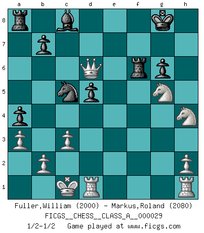 Last move : 1/2-1/2 2007 November 10 17:42:55 [Event "FICGS__CHESS__CLASS_A__000029"] [Site "FICGS"] [Date "2007.10.20"] [Round "1"] [White "Fuller,William"] [Black "Markus,Roland"] [Result "1/2-1/2"] [WhiteElo "2000"] [BlackElo "2080"] 1.e4 c6 2.d4 d5 3.f3 e6 4.Be3 Qb6 5.Nd2 Nf6 6.Bd3 c5 7.dxc5 Bxc5 8.Bxc5 Qxc5 9.Qe2 Nc6 10.O-O-O O-O 11.e5 Nd7 12.f4 Qb6 13.Ngf3 h6 14.c3 a5 15.g4 a4 16.a3 Ne7 17.f5 Nc5 18.f6 gxf6 19.exf6 Ng6 20.Bxg6 fxg6 21.g5 e5 22.Nh4 Rf7 23.Ndf3 hxg5 24.Nxg5 Rxf6 25.Qxe5 Qd6 26.Qxd6 1/2-1/2 Caro-Kann : Tartakower (fantasy) variation Queenside Castling by player White (move 10) Kingside Castling by player Black (move 10) This chess game ended in a draw. Follow this game move after move (download)The Pawns are the soul of the game. (Francois Andre Danican Philidor) Sicherlich können nur Meister einen Stil haben. Daß ein nicht-Meister auch nur ein einziges Mal in seinem Leben eine Partie folgerecht durchführte, habe ich niemals bemerkt. (Emanuel Lasker) Bobby Fischer es el mas grande genio de Ajedrez de todos los tiempos. (Alexander Kotov) Mais l'homme est une créature légère et illogique : semblable au joueur d'échecs, il n'aime que le processus du but à atteindre, non le but lui-même. (Dostoïevsky) I'll be back. (Arnold Schwarzenegger)