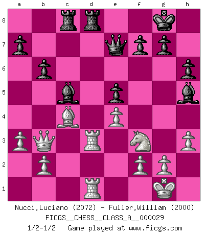 Last move : 1/2-1/2 2007 November 15 22:28:27 [Event "FICGS__CHESS__CLASS_A__000029"] [Site "FICGS"] [Date "2007.10.20"] [Round "1"] [White "Nucci,Luciano"] [Black "Fuller,William"] [Result "1/2-1/2"] [WhiteElo "2072"] [BlackElo "2000"] 1.d4 Nf6 2.c4 e6 3.Nf3 d5 4.Nc3 c6 5.Bg5 h6 6.Bxf6 Qxf6 7.e3 Nd7 8.Bd3 Bd6 9.O-O O-O 10.e4 dxc4 11.Bxc4 e5 12.d5 Nb6 13.Be2 cxd5 14.Nxd5 Nxd5 15.Qxd5 Rd8 16.Rfd1 Qe7 17.Qb3 b6 18.Bc4 Bg4 19.Rd3 Bh5 20.a3 Rac8 21.Rad1 Bc5 22.h3 1/2-1/2 Queen's pawn game Kingside Castling by player White (move 9) Kingside Castling by player Black (move 9) This chess game ended in a draw. Follow this game move after move (download)I am still a victim of Chess. It has all the beauty of art and much more. It cannot be commercialized. Chess is much purer than art in its social position. (Marcel Duchamp) Rauchen ist dem Schachspieler bei seiner Arbeit, also im Wettkampf, untersagt. (Viktor Kortschnoi) No todos los artistas son jugadores de Ajedrez, pero todos los jugadores de Ajedrez son artistas. (Marcel Duchamp) Si rien de grave n'est détecté lors de l'analyse d'une position, on joue alors le coup. Seconde règle de Blumenfeld. We cannot be sure of having something to live for unless we are willing to die for it. (Ernesto Che Guevara)