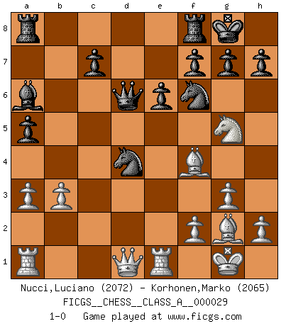 Last move : 1-0 2008 February 9 0:53:3 [Event "FICGS__CHESS__CLASS_A__000029"] [Site "FICGS"] [Date "2007.10.20"] [Round "1"] [White "Nucci,Luciano"] [Black "Korhonen,Marko"] [Result "1-0"] [WhiteElo "2072"] [BlackElo "2065"] 1.d4 Nf6 2.c4 e6 3.Nf3 b6 4.g3 Ba6 5.b3 b5 6.cxb5 Bxb5 7.Bg2 Bb4+ 8.Bd2 a5 9.O-O d5 10.Nc3 Ba6 11.a3 Bd6 12.Re1 O-O 13.e4 dxe4 14.Ng5 Nc6 15.Ncxe4 Nxd4 16.Nxd6 Qxd6 17.Bf4 1-0 This chess game has been lost on time (started : 2007.10.20 13:57:2) Queen's Indian : Nimzovich variation (exaggerated Fianchetto) Kingside Castling by player White (move 9) Kingside Castling by player Black (move 12) Player White won this chess game. Follow this game move after move (download)It is peculiar but a fact nevertheless, that gamblers in chess always have enthusiastic followers. (Botvinnik) Die FIDE ist dabei in die Hände der russischen Mafia zu fallen. (Larry Evans) Los tropiezos estan todos ahí en el tablero, esperando que se cometan. (Savielly Tartakover) Les ravages du H expliquent la différence de niveau entre Tal et Thal [Abergel]. Everybody lies. (Gregory House, House M.D.)