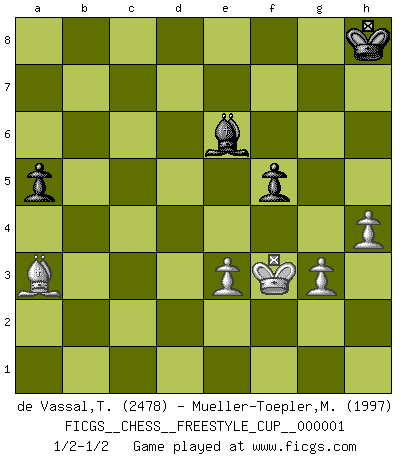 Last move : 1/2-1/2 2007 October 20 16:21:33 [Event "FICGS__CHESS__FREESTYLE_CUP__000001"] [Site "FICGS"] [Date "2007.10.20"] [Round "1"] [White "de Vassal,Thibault"] [Black "Mueller-Toepler,Michael"] [Result "1/2-1/2"] [WhiteElo "2478"] [BlackElo "1997"] 1.d4 Nf6 2.c4 e6 3.Nc3 Bb4 4.e3 O-O 5.Bd3 c5 6.Nf3 d5 7.O-O cxd4 8.exd4 dxc4 9.Bxc4 b6 10.Qe2 Bb7 11.Rd1 Bxc3 12.bxc3 Qc7 13.Bb2 Nbd7 14.Bd3 Nd5 15.Qc2 f5 16.Bf1 Nf4 17.Ne1 Rf6 18.g3 Rg6 19.c4 Rf8 20.Rac1 e5 21.c5 bxc5 22.dxc5 Bc6 23.Rd6 Kh8 24.Nd3 Nxd3 25.Bxd3 Rxd6 26.cxd6 Qxd6 27.Bxf5 Bd5 28.Bxh7 Bxa2 29.Ra1 Bg8 30.Bf5 Nc5 31.Ba3 Qa6 32.Bg6 Rf6 33.Qxc5 Rxg6 34.Qxe5 Qc6 35.Rd1 Re6 36.Qh5+ Rh6 37.Qe2 Qa6 38.Qe7 Re6 39.Qb4 Rb6 40.Qh4+ Rh6 41.Qe7 Re6 42.Qc5 Qe2 43.Rd4 Rh6 44.Qe7 Qh5 45.h4 Re6 46.Qb4 Rb6 47.Qf8 Rf6 48.Qc5 Qe2 49.Rd8 Qe1+ 50.Kg2 Qe4+ 51.Kh2 Qe2 52.Rf8 Qf3 53.Rxf6 gxf6 54.Qe3 Qxe3 55.fxe3 f5 56.Kh3 Be6 57.Kg2 a5 58.Kf3 1/2-1/2 Nimzo-Indian : 4.e3 O-O, 5.Bd3 Kingside Castling by player Black (move 4) Kingside Castling by player White (move 7) 10 pieces endgame at move 54 : White KBPPP , Black KQBPP WHITE : King + 1 Bishop 3 Pawns BLACK : King + 1 Queen 1 Bishop 2 Pawns 9 pieces endgame at move 55 : White KBPPP , Black KBPP WHITE : King + 1 Bishop 3 Pawns BLACK : King + 1 Bishop 2 Pawns This chess game ended in a draw. Follow this game move after move (download)Chess is a more highly symbolic game, but the aggressions are therefore even more frankly represented in the play. It probably began as a war game; that is, the representation of a miniature battle between the forces of two kingdoms. (Karl Meninger) Früher wurde jeder komplizierte Zug, jedes interessante Opfer mit großem Beifall und Enthusiasmus aufgenommen. Heute schaltet man einfach seinen Fritz an, und man kann sehen, was los ist, ob der Zug geht oder nicht. (Vladimir Kramnik) El muchacho (en ese entonces un niño de 12 años llamado Anatoly Karpov) no tiene ni idea de lo que es el Ajedrez y no hay futuro en absoluto para el en esta profesión. (Mikhail Botvinnik) C'est la seule position que je connaisse où les deux camps sont mals. Propos prêtés à V. Anand. Children in the dark cause accidents, accidents in the dark cause children. (Unknown)