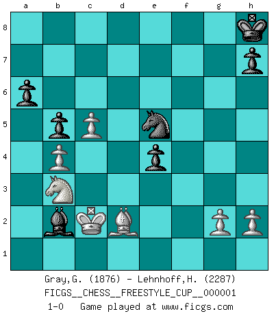 Last move : 1-0 2007 October 20 16:25:49 [Event "FICGS__CHESS__FREESTYLE_CUP__000001"] [Site "FICGS"] [Date "2007.10.20"] [Round "1"] [White "Gray,Garvin"] [Black "Lehnhoff,Heinz-Georg"] [Result "1-0"] [WhiteElo "1876"] [BlackElo "2287"] 1.e4 c5 2.Nf3 e6 3.d4 cxd4 4.Nxd4 Nc6 5.Nc3 Qc7 6.Be2 Nf6 7.O-O a6 8.Be3 Bb4 9.Na4 Be7 10.Nc3 O-O 11.f4 d5 12.e5 Ne4 13.Nxe4 dxe4 14.c3 b6 15.Nb3 Bb7 16.Qe1 Nb8 17.Qg3 Nd7 18.Nd4 g6 19.Rac1 Kh8 20.b4 Rad8 21.a3 Rg8 22.c4 Nb8 23.Rfd1 Rge8 24.Rd2 Nc6 25.Qf2 Nb8 26.Rcd1 Nd7 27.Qg3 Rg8 28.Qe1 g5 29.f5 Nxe5 30.fxe6 Bc8 31.exf7 Nxf7 32.Nb3 Ne5 33.Rxd8 Rxd8 34.Rxd8+ Bxd8 35.c5 b5 36.Qd2 Qd7 37.Bxg5 Qxd2 38.Bxd2 Bf6 39.Bh6 Nc6 40.Kf2 Be6 41.Bd1 Bd5 42.Bc2 Ne5 43.Ke2 Bc4+ 44.Kd2 Bd5 45.Kd1 Ng4 46.Bf4 Bb2 47.Na5 Bxa3 48.Bd2 Bb2 49.Bb3 Bxb3+ 50.Nxb3 Ne5 51.Kc2 1-0 Sicilian : Taimanov (Bastrikov) variation Kingside Castling by player White (move 7) Kingside Castling by player Black (move 10) Player White won this chess game. Follow this game move after move (download)Spassky will not be psyched out by Fischer. (Mike Goodall) Computer sind die einzigen Gegner, die nicht immer eine Ausrede auf Lager haben, wenn sie gegen mich verlieren. (Robert James Fischer) Ciertamente el estado mental actual de Bobby Fischer es una tragedia. Uno de los mas grandes jugadores de Ajedrez del mundo -el orgullo y pena del Ajedrez Americano. (Frank Brady) Les échecs, c'est l'art d'analyser. (Mikhail Botvinnik) Winning isn't everything... but losing is nothing. (Mednis)