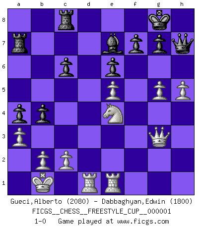 Last move : 1-0 2007 October 20 15:46:46 [Event "FICGS__CHESS__FREESTYLE_CUP__000001"] [Site "FICGS"] [Date "2007.10.20"] [Round "1"] [White "Gueci,Alberto"] [Black "Dabbaghyan,Edwin"] [Result "1-0"] [WhiteElo "2080"] [BlackElo "1800"] 1.e4 c6 2.d4 d5 3.Nd2 dxe4 4.Nxe4 Bf5 5.Ng3 Bg6 6.h4 h6 7.Nf3 Nd7 8.h5 Bh7 9.Bd3 Bxd3 10.Qxd3 e6 11.Bf4 Ngf6 12.O-O-O Be7 13.Kb1 Qa5 14.Ne5 O-O 15.Nxd7 Nxd7 16.Ne4 Qf5 17.Bc7 Rfc8 18.g4 Qh7 19.Be5 a5 20.Rhe1 a4 21.a3 b5 22.Qg3 Ra7 23.f4 Nxe5 24.dxe5 b4 25.g5 hxg5 26.fxg5 1-0 Caro-Kann : 3.Nd2 Queenside Castling by player White (move 12) Kingside Castling by player Black (move 14) Player White won this chess game. Follow this game move after move (download)A good player is always lucky. (Jose Raul Capablanca) Eine Person mit durchschnittlichem IQ kann etwa eine ELO von 2000 erreichen. (Jonathan Levitt) Ayuda a tus piezas para que ellas te puedan ayudar. (Paul Morphy) Pour moi, les échecs ne sont pas un jeu mais un art. (Alexandre Alekhine) There are two types of people in this world, good and bad. The good sleep better, but the bad seem to enjoy the waking hours much more. (Woody Allen)