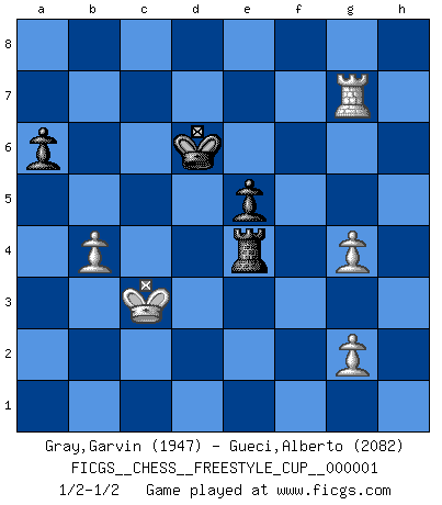 Last move : 1/2-1/2 2007 October 20 19:15:15 [Event "FICGS__CHESS__FREESTYLE_CUP__000001"] [Site "FICGS"] [Date "2007.10.20"] [Round "1"] [White "Gray,Garvin"] [Black "Gueci,Alberto"] [Result "1/2-1/2"] [WhiteElo "1947"] [BlackElo "2082"] 1.e4 c5 2.Nf3 d6 3.d4 cxd4 4.Nxd4 Nf6 5.Nc3 a6 6.Be2 e5 7.Nb3 Be7 8.O-O O-O 9.Be3 Be6 10.Qd2 Nbd7 11.a4 Rc8 12.a5 Qc7 13.Rfd1 Rfe8 14.Qe1 Qc6 15.Bf3 h6 16.h3 Nh7 17.Nd2 Ng5 18.Bg4 Bxg4 19.hxg4 Nf6 20.Bxg5 hxg5 21.Qe2 g6 22.Nf1 Kg7 23.Ra3 Rh8 24.Ne3 Bd8 25.Qd3 Qd7 26.f3 b5 27.Ncd5 Nxd5 28.Nxd5 b4 29.Rb3 Qc6 30.Ne3 Bxa5 31.Qxd6 Rhe8 32.Kf1 Re6 33.Qxc6 Rexc6 34.Ke2 Bb6 35.Rxb4 Bxe3 36.Kxe3 Rxc2 37.Rd2 Rc1 38.Ra4 R8c6 39.b4 R1c3+ 40.Ke2 Rc2 41.Rxc2 Rxc2+ 42.Kd3 Rc6 43.Ra2 Kf6 44.Rc2 Rb6 45.Kc4 Ke6 46.Ra2 Rc6+ 47.Kb3 Rd6 48.Ra5 f5 49.Kc4 fxg4 50.fxg4 Rc6+ 51.Rc5 Rd6 52.Kc3 Rd4 53.Rc6+ Kd7 54.Rxg6 Rxe4 55.Rxg5 Kd6 56.Rg7 1/2-1/2 Sicilian : Najdorf, Opovcensky variation Kingside Castling by player White (move 8) Kingside Castling by player Black (move 8) 10 pieces endgame at move 54 : White KRPPP , Black KRPPP WHITE : King + 1 Rook 3 Pawns BLACK : King + 1 Rook 3 Pawns 9 pieces endgame at move 55 : White KRPPP , Black KRPP WHITE : King + 1 Rook 3 Pawns BLACK : King + 1 Rook 2 Pawns This chess game ended in a draw. Follow this game move after move (download)Up to this point White has been following well-known analysis. But now he makes a fatal error: he begins to use his own head. (Siegbert Tarrasch) Jeder Fehler erscheint unglaublich dumm, wenn andre ihn begehen. (Georg Christoph Lichtenberg) Un mal día en el Ajedrez, es mejor que cualquier buen día en el trabajo. (Anonymous) Toutes choses étant égales, c'est la conviction qui gagne. Alliée à une volonté de vaincre, elle sert de détonateur, suscite des idées, disperse les doutes et aide à penser clairement. (Robert Fischer) The Internet isn't free. It just has an economy that makes no sense to capitalism. (Brad Shapcott)