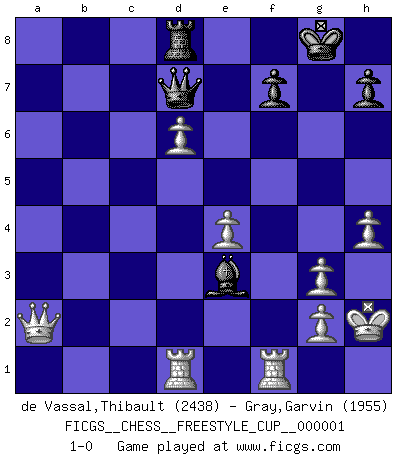 Last move : 1-0 2007 October 20 21:58:5 [Event "FICGS__CHESS__FREESTYLE_CUP__000001"] [Site "FICGS"] [Date "2007.10.20"] [Round "1"] [White "de Vassal,Thibault"] [Black "Gray,Garvin"] [Result "1-0"] [WhiteElo "2438"] [BlackElo "1955"] 1.e4 e5 2.Nf3 Nc6 3.Bb5 a6 4.Ba4 Nf6 5.O-O Be7 6.Re1 b5 7.Bb3 d6 8.c3 O-O 9.h3 Na5 10.Bc2 c5 11.d4 Qc7 12.Nbd2 cxd4 13.cxd4 Nc6 14.Nb3 a5 15.Be3 a4 16.Nbd2 Bd7 17.Rc1 Qb7 18.Qe2 Rfe8 19.Bd3 Rab8 20.d5 Nb4 21.Bb1 Ra8 22.a3 Na6 23.Bd3 Bf8 24.Bg5 Nc5 25.Bxf6 gxf6 26.Nh4 Bh6 27.Rcd1 Rac8 28.Nf1 Bg5 29.Qh5 b4 30.Ng3 bxa3 31.bxa3 Nxd3 32.Rxd3 Qb5 33.R3d1 Rc2 34.Nhf5 Qc5 35.Rf1 Rc3 36.Kh2 Rxa3 37.h4 Rxg3 38.fxg3 Bxf5 39.Rxf5 Be3 40.Rxf6 Rf8 41.Qg4+ Kh8 42.Qd7 Qa7 43.Qxd6 Kg8 44.Qxe5 a3 45.d6 a2 46.R6f1 Qd7 47.Qa5 Rd8 48.Qxa2 1-0 Ruy Lopez : Closed Kingside Castling by player White (move 5) Kingside Castling by player Black (move 8) Player White won this chess game. Follow this game move after move (download)Chess is the art which expresses the science of logic. (Mikhail Botvinnik) Wer sich die Fähigkeit anerziehen will im Schach selbstständig zu denken, der muß alles meiden, was leblos ist: ausgeklügelte Theorien, die sich auf sehr wenige Beispiele und eine Menge Hirngespinste stützen. (Emanuel Lasker) Cuando no sepas que mover, espera por una idea que se le venga a la la cabeza de tu oponente. Tenlo por seguro de que esa idea estará incorrecta. (Siegbert Tarrasch) J'ai vu le vaincu d'Echecs jouer des années durant dans l'espoir de la fête de la victoire. Car tu es plus riche de ce qu'elle existe si même elle n'est point pour toi. Ainsi de la perle du fond des mers. (Antoine de Saint-Exupéry) The absolute truth is the thing that makes people laugh. (Carl Reiner)