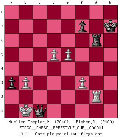 Last move : 0-1 2007 October 20 21:11:44 [Event "FICGS__CHESS__FREESTYLE_CUP__000001"] [Site "FICGS"] [Date "2007.10.20"] [Round "1"] [White "Mueller-Toepler,Michael"] [Black "Fisher,David"] [Result "0-1"] [WhiteElo "2040"] [BlackElo "2000"] 1.e4 c5 2.Nf3 d6 3.d4 cxd4 4.Nxd4 Nf6 5.Nc3 a6 6.f3 e5 7.Nb3 Be6 8.Be3 Be7 9.Qd2 O-O 10.O-O-O Nbd7 11.g4 b5 12.g5 b4 13.Ne2 Ne8 14.Ng3 a5 15.Kb1 a4 16.Nc1 Qb8 17.Nf5 Bd8 18.Nxd6 b3 19.Nc4 bxa2+ 20.Nxa2 Be7 21.h4 a3 22.b3 Nc7 23.h5 Rd8 24.Qf2 Nb5 25.g6 Nd4 26.gxh7+ Kxh7 27.h6 g5 28.Rxd4 exd4 29.Bxd4 Ne5 30.Nxe5 Qxe5 31.c3 Qf4 32.Bh3 Bxh3 33.Rxh3 Bf6 34.Rh1 Bxd4 35.cxd4 g4 36.d5 Rg8 37.Rf1 g3 38.Qe2 Ra6 39.e5 g2 40.Rg1 Rxh6 41.Qc2+ R8g6 42.Rxg2 Rh1+ 43.Nc1 Rxc1+ 44.Qxc1 Qxc1+ 0-1 Sicilian : Najdorf Kingside Castling by player Black (move 9) Queenside Castling by player White (move 10) Player Black won this chess game. Follow this game move after move (download)What would Chess be without silly mistakes ? (Kurt Richter) Die Jungen erwarten, dass Opa einfach umfällt. Dann aber kann Opa fünf Stunden lang Schach spielen und die jungen Gegner an die Wand drücken. (Viktor Kortschnoi) Combinaciones deslumbrantes son para la mayoría, mover madera es para los pocos. (Georg Kieninger) On a dit que l'homme se distingue de l'animal par le fait qu'il achète plus de livres qu'il ne peut en lire. Je voudrais suggérer qu'inclure à la liste des livres quelques livres d'échecs rendrait la distinction manifeste. (Edward Lasker) Be who you are, and say what you feel because those who mind don't matter, and those who matter don't mind. (Dr Seuss)