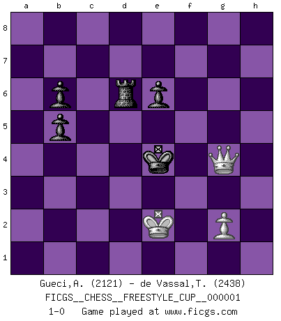 Last move : 1-0 2007 October 21 15:42:5 [Event "FICGS__CHESS__FREESTYLE_CUP__000001"] [Site "FICGS"] [Date "2007.10.21"] [Round "1"] [White "Gueci,Alberto"] [Black "de Vassal,Thibault"] [Result "1-0"] [WhiteElo "2121"] [BlackElo "2438"] 1.e4 c5 2.Nf3 d6 3.d4 cxd4 4.Nxd4 Nf6 5.Nc3 a6 6.Bg5 e6 7.f4 Qb6 8.Qd2 Qxb2 9.Rb1 Qa3 10.e5 dxe5 11.fxe5 Nfd7 12.Ne4 h6 13.Bh4 Qxa2 14.Rd1 Qd5 15.Qe3 Qxe5 16.Be2 Bc5 17.Bg3 Bxd4 18.Rxd4 Qa5+ 19.Rd2 O-O 20.Bd6 Rd8 21.Qg3 Qf5 22.Be5 Qg6 23.Qh4 Nc6 24.Bh5 Qf5 25.Bxg7 Nc5 26.Nxc5 Kxg7 27.Rf1 Qe5+ 28.Ne4 Qa1+ 29.Rd1 Rxd1+ 30.Bxd1 Qe5 31.Rf6 Bd7 32.Qxh6+ Kg8 33.Rf4 f5 34.Rh4 Rd8 35.Rh3 Qxe4+ 36.Kf1 Qe5 37.Rg3+ Qxg3 38.hxg3 Kf7 39.Qh7+ Kf6 40.Bf3 Ke5 41.Bxc6 Bxc6 42.Qc7+ Rd6 43.c4 b6 44.Ke2 Bb5 45.Qg7+ Ke4 46.cxb5 axb5 47.g4 fxg4 48.Qxg4+ 1-0 Sicilian : Najdorf, 7...Qb6 Kingside Castling by player Black (move 19) 10 pieces endgame at move 46 : White KQPP , Black KRPPPP WHITE : King + 1 Queen 2 Pawns BLACK : King + 1 Rook 4 Pawns 9 pieces endgame at move 47 : White KQP , Black KRPPPP WHITE : King + 1 Queen 1 Pawn BLACK : King + 1 Rook 4 Pawns 8 pieces endgame at move 48 : White KQP , Black KRPPP WHITE : King + 1 Queen 1 Pawn BLACK : King + 1 Rook 3 Pawns Player White won this chess game. Follow this game move after move (download)Dazzling combinations are for the many, shifting wood is for the few. (Georg Kieninger) Wer nie einen Fehler gemacht hat, hat nie etwas Neues ausprobiert. (Albert Einstein) El Ajedrez es un mar en el cual un mosquito puede beber y un elefante puede bañarse. (Refrán Hindú) Demandez au pauvre Cg1 ce qu'il en pense. Eduard Gufeld à propos de la variante Saemisch de l'Est-Indienne. I believe in luck. How else can you explain the success of those you dislike ? (Jean Cocteau)