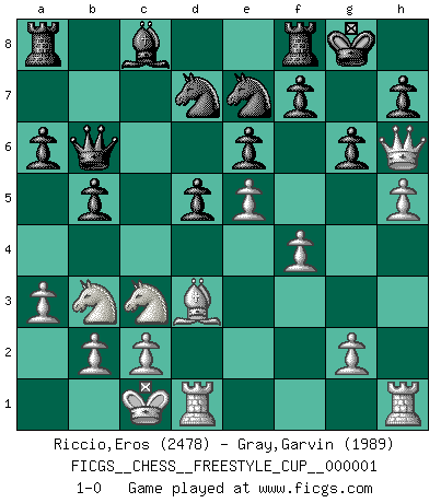 Last move : 1-0 2007 October 21 18:34:24 [Event "FICGS__CHESS__FREESTYLE_CUP__000001"] [Site "FICGS"] [Date "2007.10.21"] [Round "1"] [White "Riccio,Eros"] [Black "Gray,Garvin"] [Result "1-0"] [WhiteElo "2478"] [BlackElo "1989"] 1.e4 e6 2.d4 d5 3.Nc3 Nf6 4.e5 Nfd7 5.f4 c5 6.Nf3 Nc6 7.Be3 cxd4 8.Nxd4 Bc5 9.Qd2 O-O 10.O-O-O a6 11.Nb3 Bxe3 12.Qxe3 b5 13.Bd3 Qb6 14.Qh3 g6 15.Qh6 Nb4 16.a3 Nc6 17.h4 Ne7 18.h5 1-0 French : Steinitz, Boleslavsky variation Kingside Castling by player Black (move 9) Queenside Castling by player White (move 10) Player White won this chess game. Follow this game move after move (download)Bobby is the most misunderstood, misquoted celebrity walking the face of this earth. (Yasser Seirawan) Ohne Fehler kann es keine Brillanz geben. (Emanuel Lasker) Uno por uno, yo los acribillé, mi superioridad muy pronto se volvio aparente. (Jose Capablanca) Avant la finale, les dieux ont créé le milieu de partie. (Tarrasch) A good book on your shelf is a friend that turns its back on you and remains a friend. (Author unknown)
