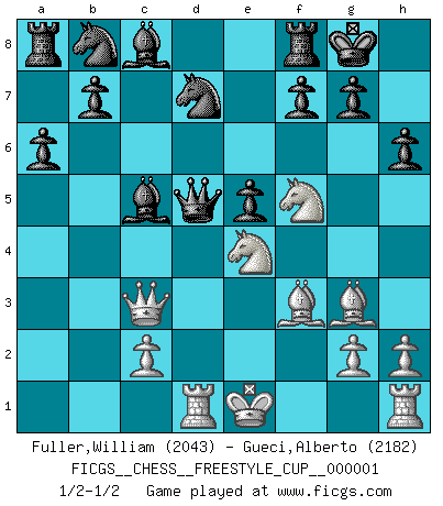 Last move : 1/2-1/2 2007 October 21 17:59:11 [Event "FICGS__CHESS__FREESTYLE_CUP__000001"] [Site "FICGS"] [Date "2007.10.21"] [Round "1"] [White "Fuller,William"] [Black "Gueci,Alberto"] [Result "1/2-1/2"] [WhiteElo "2043"] [BlackElo "2182"] 1.e4 c5 2.Nf3 d6 3.d4 cxd4 4.Nxd4 Nf6 5.Nc3 a6 6.Bg5 e6 7.f4 Qb6 8.Qd2 Qxb2 9.Rb1 Qa3 10.e5 dxe5 11.fxe5 Nfd7 12.Ne4 h6 13.Bh4 Qxa2 14.Rd1 Qd5 15.Qe3 Qxe5 16.Be2 Bc5 17.Bg3 Qd5 18.Bf3 O-O 19.Qc3 e5 20.Nf5 1/2-1/2 Sicilian : Najdorf, 7...Qb6 Kingside Castling by player Black (move 18) This chess game ended in a draw. Follow this game move after move (download)Don't even mention losing to me. I can't stand to think of it. (Bobby Fischer) Es ist peinlich, dass ich nie Weltmeister wurde. Es wäre leicht, Leonid Breschnjew als Ursache vorzuschieben, dessen Apparat den Vorzeigekommunisten Anatoli Karpow in allem unterstützte. Aber Garri Kasparow zum Beispiel, der ebenfalls von den Sowjets unerwünscht war, hat trotz der Widerstände den WM-Titel erobert. (Viktor Kortschnoi) El Ajedrez es imaginación. (David Bronstein) Seul un grand joueur sait à quel point il joue faiblement. (Xavier Tartacover) Locking firmely the window serves nothing, only small thiefs pass through there, the big thiefs enter through the front door. (Luc-Olivier Leclerc)