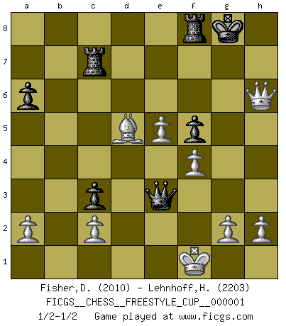 Last move : 1/2-1/2 2007 October 21 18:6:32 [Event "FICGS__CHESS__FREESTYLE_CUP__000001"] [Site "FICGS"] [Date "2007.10.21"] [Round "1"] [White "Fisher,David"] [Black "Lehnhoff,Heinz-Georg"] [Result "1/2-1/2"] [WhiteElo "2010"] [BlackElo "2203"] 1.e4 c5 2.Nf3 e6 3.d4 cxd4 4.Nxd4 Nc6 5.Nc3 Qc7 6.Be2 Nf6 7.O-O a6 8.Be3 Bb4 9.Na4 Be7 10.Nxc6 bxc6 11.Nb6 Rb8 12.Nxc8 Qxc8 13.Bd4 c5 14.Be5 Rb6 15.Qd3 d6 16.Bc3 O-O 17.b3 d5 18.e5 Nd7 19.f4 c4 20.bxc4 Rc6 21.Qh3 Nb6 22.Rf3 dxc4 23.Rg3 f5 24.Qh6 Bc5+ 25.Kf1 Rc7 26.Bf3 Kh8 27.Qg5 Qd7 28.Rd1 Qa4 29.Bd4 c3 30.Bxc5 Qc4+ 31.Rd3 Qxc5 32.Rh3 Nc4 33.Qg6 h6 34.Qxe6 Ne3+ 35.Rxe3 Qxe3 36.Rxh6+ gxh6 37.Qxh6+ Kg8 38.Bd5+ 1/2-1/2 Sicilian : Taimanov (Bastrikov) variation Kingside Castling by player White (move 7) Kingside Castling by player Black (move 16) This chess game ended in a draw. Follow this game move after move (download)Chess is the gymnasium of the mind. (Blaise Pascal) Obwohl ich vom Stil her kaum zu den Priestern der Schachkunst gezählt werde, halte ich Schach doch für eine Kunst. (Tigran Petrosjan) Nunca nadie ha ganado una partida de Ajedrez rindiendose. (Unknown) Des idées, des idées, j'en ai cent, j'en ai mille. Des bonnes, des mauvaises, applicables, irréalisables... Il suffit de faire le tri ! (Roos) Creativity is allowing yourself to make mistakes. Art is knowing which ones to keep. (Scott Adams)