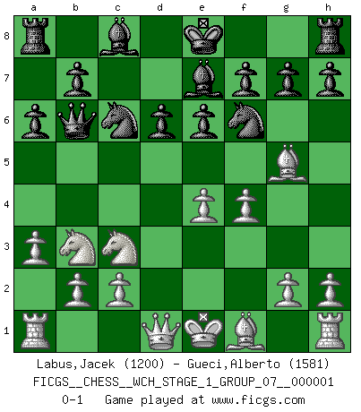 Last move : 0-1 2006 August 11 5:18:11 [Event "FICGS__CHESS__WCH_STAGE_1_GROUP_07__000001"] [Site "FICGS"] [Date "2006.07.01"] [Round "1"] [White "Labus,Jacek"] [Black "Gueci,Alberto"] [Result "0-1"] [WhiteElo "1200"] [BlackElo "1581"] 1.e4 c5 2.Nf3 d6 3.d4 cxd4 4.Nxd4 Nf6 5.Nc3 a6 6.Bg5 e6 7.f4 Qb6 8.a3 Nc6 9.Nb3 Be7 0-1 This chess game has been lost on time (started : 2006.07.01 16:9:0) Sicilian : Najdorf, 7...Qb6 Player Black won this chess game. Follow this game move after move (download)My opponents make good moves too. Sometimes I don't take these things into consideration. (Bobby Fischer) Das Schachspiel übertrifft alle anderen Spiele so weit wie der Chimborasso einen Misthaufen. (Arthur Schopenhauer) No es suficiente ser un buen jugador, se debe también de jugar bién. (Siegbert Tarrasch) Je menace de comprendre la position. (Anonyme) Perhaps the current trend of many chess professionals taking up the more lucrative pastime of poker is not a wholly negative one. It may not be too late for humans to relearn how to take risks in order to innovate and thereby maintain the advanced lifestyles we enjoy. And if it takes a poker-playing supercomputer to remind us that we can't enjoy the rewards without taking the risks, so be it. (The Chess Master and the Computer, by Garry Kasparov - 2010)
