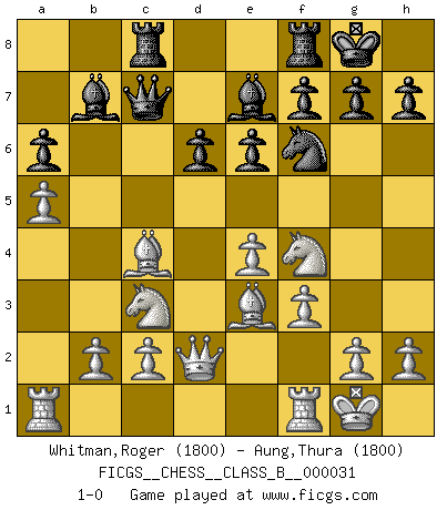 Last move : 1-0 2008 January 21 23:34:11 [Event "FICGS__CHESS__CLASS_B__000031"] [Site "FICGS"] [Date "2007.10.22"] [Round "1"] [White "Whitman,Roger"] [Black "Aung,Thura"] [Result "1-0"] [WhiteElo "1800"] [BlackElo "1800"] 1.e4 c5 2.Nf3 d6 3.d4 cxd4 4.Nxd4 Nf6 5.Nc3 a6 6.f3 Nbd7 7.Be3 b5 8.a4 b4 9.Nc6 Qc7 10.Nxb4 e6 11.Nd3 Bb7 12.Be2 Be7 13.O-O O-O 14.Qd2 Nb6 15.Nf4 Rac8 16.a5 Nc4 17.Bxc4 1-0 Sicilian : Najdorf Kingside Castling by player White (move 13) Kingside Castling by player Black (move 13) Player White won this chess game. Follow this game move after move (download)Of Chess it has been said that life is not long enough for it, but that is the fault of life, not Chess. (William Ewart Napier) Wenn du gegen Bobby spielst, ist es keine Frage von gewinnen oder verlieren. Es ist eine Frage des Überlebens. (Boris Vassilievich Spassky) Los libros de Ajedrez deben de usarse igual como usamos los anteojos: para mejorar la vista, aunque algunos jugadores los quieren usar como si ellos les otorgaran la vision. (José Raúl Capablanca) Vous savez, camarade Pachman, je n'éprouve pas de plaisir à être ministre, je jouerais plutôt aux échecs comme vous, ou alors ferais une révolution au Venezuela. (Che Guevara à Ludek Pachman, 'Checkmate in Prague', 1975) Information on the Internet is subject to the same rules and regulations as conversation at a bar. (George Lundberg)