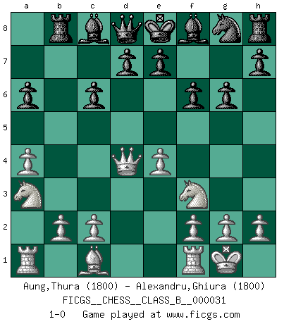 Last move : 1-0 2007 December 16 9:8:22 [Event "FICGS__CHESS__CLASS_B__000031"] [Site "FICGS"] [Date "2007.10.22"] [Round "1"] [White "Aung,Thura"] [Black "Alexandru,Ghiura"] [Result "1-0"] [WhiteElo "1800"] [BlackElo "1800"] 1.e4 c5 2.Nf3 Nc6 3.Bb5 a6 4.Bxc6 bxc6 5.a4 Rb8 6.O-O g6 7.d4 cxd4 8.Qxd4 f6 9.Na3 1-0 This chess game has been lost on time (started : 2007.10.22 3:19:40) Sicilian : Nimzovich-Rossolimo attack (without ...d6) Kingside Castling by player White (move 6) Player White won this chess game. Follow this game move after move (download)He who takes the Queen's Knight's Pawn will sleep in the streets. (Anonymous) Ich könnte leicht behaupten: Ja,ja, Leonid Breschnew wollte nicht, daß ich Weltmeister werde. In der Tat war die Sache komplizierter. (Viktor Kortschnoi) La única cosa que los jugadores de Ajedrez tienen en común, es el Ajedrez. (Lodewijk Prins) Mais l'homme est une créature légère et illogique : semblable au joueur d'échecs, il n'aime que le processus du but à atteindre, non le but lui-même. (Dostoïevsky) A specialist learns more and more about less and less until he knows everything about nothing. (Nicholas Murray Butler)