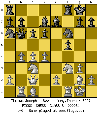 Last move : 1-0 2008 January 22 11:36:38 [Event "FICGS__CHESS__CLASS_B__000031"] [Site "FICGS"] [Date "2007.10.22"] [Round "1"] [White "Thomas,Joseph"] [Black "Aung,Thura"] [Result "1-0"] [WhiteElo "1800"] [BlackElo "1800"] 1.c4 e5 2.Nc3 d6 3.g3 Be7 4.Bg2 f5 5.d4 Nf6 6.Nf3 e4 7.Ng5 O-O 8.f3 exf3 9.Nxf3 c6 10.O-O Na6 11.Rb1 Bd7 12.Qc2 Qb6 13.b4 1-0 English Opening Kingside Castling by player Black (move 7) Kingside Castling by player White (move 10) Player White won this chess game. Follow this game move after move (download)Chess teaches you to control the initial excitement you feel when you see something that looks good and it trains you to think objectively when you're in trouble. (Stanley Kubrick) Ich habe die Schachforschung dermaßen betrieben, dass sie auf eine wissenschaftliche Basis gestellt wurde. (Mikhail Moiseyevich Botvinik) Cuando me preguntan: -¿Cual es el secreto que te hace hacer mejores movidas que tus oponentes?, Yo respondo: Me da gusto que me pregunten eso, porque, como veran, hay una simple razón. Yo pienso mis propias movidas y dejo a mi oponente que el piense las suyas. (Alexander Alekhine) J'ai vu le vaincu d'Echecs jouer des années durant dans l'espoir de la fête de la victoire. Car tu es plus riche de ce qu'elle existe si même elle n'est point pour toi. Ainsi de la perle du fond des mers. (Antoine de Saint-Exupéry) Unless in communicating with it one says exactly what one means, trouble is bound to result. (Alan Turing, about computers)