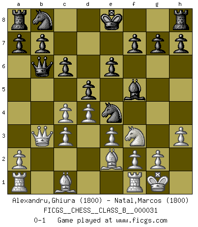 Last move : 0-1 2008 January 24 23:39:41 [Event "FICGS__CHESS__CLASS_B__000031"] [Site "FICGS"] [Date "2007.10.22"] [Round "1"] [White "Alexandru,Ghiura"] [Black "Natal,Marcos"] [Result "0-1"] [WhiteElo "1800"] [BlackElo "1800"] 1.d4 d5 2.c4 c6 3.Nf3 Nf6 4.e3 Bg4 5.Be2 e6 6.h3 Bf5 7.Nc3 Bb4 8.O-O Bxc3 9.bxc3 Ne4 10.Qb3 Qb6 0-1 QGD Slav : 4.e3 Kingside Castling by player White (move 8) Player Black won this chess game. Follow this game move after move (download)We must make sure that Chess will not be like a dead language, very interesting, but for a very small group. (Sytze Faber) Frage: Gibt es etwas was Sie mehr lieben als Autobahnen ohne Tempobegrenzungen? - Antwort: Deutsche Frauen ohne Tempobegrenzungen. (Loek van Wely) Bobby es el jugador de Ajedrez mas fino que este país jamás haya producido. Su memoria para las movidas, su brillantez en soñar combinaciones y su feróz determinación por la victoria son algo extraño. (John Collins) Plusieurs personnes se sont demandées comment Tal faisait pour gagner... En fait, c'est très simple ! Il met ses pièces au centre de l'échiquier et les sacrifie quelque part ! (David Bronstein) Computer Science is no more about computers than astronomy is about telescopes. (Edsger W. Dijkstra)