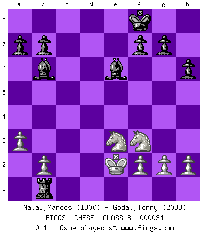 Last move : 0-1 2008 March 3 10:21:31 [Event "FICGS__CHESS__CLASS_B__000031"] [Site "FICGS"] [Date "2007.10.22"] [Round "1"] [White "Natal,Marcos"] [Black "Godat,Terry"] [Result "0-1"] [WhiteElo "1800"] [BlackElo "2093"] 1.d4 d5 2.c4 c6 3.Nc3 Nf6 4.Nf3 e6 5.Bg5 h6 6.Bxf6 Qxf6 7.cxd5 exd5 8.e4 dxe4 9.Qe2 Bf5 10.Nxe4 Qe6 11.Nc3 Bd6 12.Qxe6+ Bxe6 13.Bd3 Nd7 14.O-O Nf6 15.Ne5 Rd8 16.Rad1 O-O 17.Rfe1 Rfe8 18.Bc2 Bc7 19.a3 Bb6 20.Nf3 Bg4 21.Rxe8+ Rxe8 22.Bb3 Kf8 23.d5 cxd5 24.Bxd5 Nxd5 25.Nxd5 Rd8 26.Kf1 Be6 27.Ne3 Rxd1+ 28.Ke2 Rb1 0-1 QGD Slav defense Kingside Castling by player White (move 14) Kingside Castling by player Black (move 16) Player Black won this chess game. Follow this game move after move (download)I have added these principles to the law: get the Knights into action before both Bishops are developed. (Emanuel Lasker) Heutzutage gewinnt im Turnier nicht derjenige Spieler, der weitreichende Pläne entwirft, sondern einfach jener, der Zug um Zug kämpft. (David Bronstein) El Ajedrez es imaginación. (David Bronstein) Même si vous avez un bon coup à faire, regardez toujours s'il n'y en a pas un qui lui soit préférable. (Pedro Damiano) History is the quarrels of popes and kings, with wars or pestilences in every page; the men all so good for nothing, and hardly any women at all. (Jane Austen)