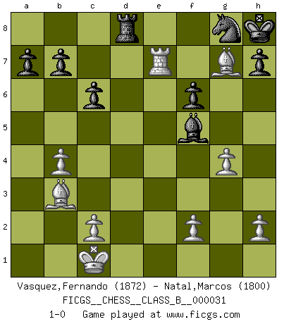 Last move : 1-0 2008 March 15 16:44:14 [Event "FICGS__CHESS__CLASS_B__000031"] [Site "FICGS"] [Date "2007.10.22"] [Round "1"] [White "Vasquez,Fernando"] [Black "Natal,Marcos"] [Result "1-0"] [WhiteElo "1872"] [BlackElo "1800"] 1.e4 e5 2.Nf3 Nc6 3.d4 exd4 4.Nxd4 Nxd4 5.Qxd4 Ne7 6.Nc3 Nc6 7.Qc4 Bb4 8.Be3 O-O 9.Be2 Bxc3+ 10.Qxc3 f5 11.exf5 Rxf5 12.O-O-O Kh8 13.g4 Ra5 14.b4 Rxa2 15.Bc4 Ra4 16.Rhe1 Qf8 17.Bh6 Ne7 18.Rd4 Ra3 19.Qxa3 d5 20.Qb2 Bf5 21.Bxd5 c6 22.Bb3 Qf6 23.Rd8+ Ng8 24.Qxf6 gxf6 25.Re7 Rxd8 26.Bg7+ 1-0 Scotch game Kingside Castling by player Black (move 8) Queenside Castling by player White (move 12) Player White won this chess game. Follow this game move after move (download)Avoid the crowd. Do your own thinking independently. Be the Chess player, not the Chess piece. (Ralph Charell) Der 70jährige Viktor Kortschnoi: Die Rentenanstalt wollte mich zwingen in Rente zu gehen. Meine Frau erhält jetzt eine Pension- und ich zahle weiter in die Rentenkasse ein! (Viktor Kortschnoi) Ayuda a tus piezas para que ellas te puedan ayudar. (Paul Morphy) Les écrivains ont utilisé les échecs pour analyser les côtés extrêmes de la nature humaine. Dans ce cadre, les échecs offrent un champ d'expérimentation idéal. Mais on pourrait faire la même chose avec la peinture. Et là, en vous référant à Van Gogh, vous ne tirerez pas de conclusion définitive sur les peintres. (Gary Kasparov) A shortcut is the longest distance between two points. (Don Groves)