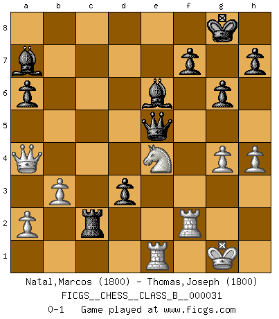 Last move : 0-1 2008 March 3 10:18:1 [Event "FICGS__CHESS__CLASS_B__000031"] [Site "FICGS"] [Date "2007.10.22"] [Round "1"] [White "Natal,Marcos"] [Black "Thomas,Joseph"] [Result "0-1"] [WhiteElo "1800"] [BlackElo "1800"] 1.d4 Nf6 2.c4 e6 3.Nc3 c5 4.e3 d5 5.Nf3 Nc6 6.cxd5 exd5 7.Bb5 Bd6 8.O-O O-O 9.dxc5 Bxc5 10.Ng5 a6 11.Bd3 Bg4 12.f3 Bc8 13.Qc2 g6 14.Na4 Ba7 15.Rf2 d4 16.e4 Nb4 17.Qc4 Nxd3 18.Qxd3 b5 19.e5 Bf5 20.Qd2 Nd5 21.g4 Ne3 22.h4 Be6 23.b3 bxa4 24.Ba3 d3 25.Bxf8 Qd4 26.Re1 Rxf8 27.Ne4 Rc8 28.Qa5 Nxg4 29.fxg4 Rc2 30.Qxa4 Qxe5 0-1 Queen's pawn game Kingside Castling by player White (move 8) Kingside Castling by player Black (move 8) Player Black won this chess game. Follow this game move after move (download)Bobby Fischer's current state of mind is indeed a tragedy. One of the world's greatest Chess players - the pride and sorrow of American Chess. (Frank Brady) Je älter ich werde, um so mehr schätze ich die Bauern. (Paul Keres) El poder defensivo de una pieza clavada, solamente es imaginario. (Aaron Nimzovich) Nous vivons dans un monde échiquéen : chaque jour qui passe est un défi à relever. (Philosophe Sasha) Tomorrow's what you make of it. (Horatio Caine, C.S.I. Miami)