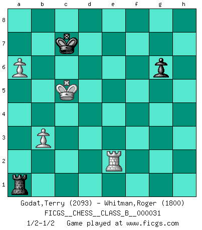 Last move : 1/2-1/2 2007 November 29 6:6:22 [Event "FICGS__CHESS__CLASS_B__000031"] [Site "FICGS"] [Date "2007.10.22"] [Round "1"] [White "Godat,Terry"] [Black "Whitman,Roger"] [Result "1/2-1/2"] [WhiteElo "2093"] [BlackElo "1800"] 1.e4 c5 2.Nf3 d6 3.d4 cxd4 4.Nxd4 Nf6 5.Nc3 a6 6.Be3 e6 7.f3 b5 8.Qd2 Bb7 9.g4 Nfd7 10.O-O-O Nb6 11.Bg5 Be7 12.Bxe7 Qxe7 13.Nb3 Nc8 14.h4 b4 15.Na4 a5 16.Bb5+ Bc6 17.Nd4 Bxb5 18.Nxb5 Ra6 19.Qg5 Qxg5+ 20.hxg5 Rc6 21.Nd4 Rc7 22.g6 fxg6 23.Nxe6 Re7 24.Nd4 O-O 25.g5 Nd7 26.Rh3 Ne5 27.Rdh1 Nf7 28.Rxh7 Nh6 29.R7xh6 gxh6 30.Rxh6 Kg7 31.c3 Re5 32.Rh2 Rh8 33.Rg2 Rh3 34.Kc2 bxc3 35.Nxc3 Nb6 36.b3 d5 37.Nc6 Re6 38.Nxa5 Rxf3 39.Nxd5 Nxd5 40.exd5 Rd6 41.a4 Rxd5 42.Nc4 R5d3 43.Nd2 Rh3 44.Kb2 Kf8 45.Ka3 Ke7 46.a5 Kd7 47.Ka4 Rhg3 48.Re2 Rd4+ 49.Nc4 Rxg5 50.a6 Rd1 51.Kb4 Ra1 52.Nb6+ Kc7 53.Na4 Rg4+ 54.Kb5 Rg5+ 55.Nc5 Rxc5+ 56.Kxc5 1/2-1/2 Sicilian : Najdorf, Byrne (English) attack Queenside Castling by player White (move 10) Kingside Castling by player Black (move 24) 10 pieces endgame at move 41 : White KRNPPP , Black KRRP WHITE : King + 1 Rook 1 Knight 3 Pawns BLACK : King + 2 Rooks 1 Pawn 9 pieces endgame at move 49 : White KRNPP , Black KRRP WHITE : King + 1 Rook 1 Knight 2 Pawns BLACK : King + 2 Rooks 1 Pawn 8 pieces endgame at move 55 : White KRPP , Black KRRP WHITE : King + 1 Rook 2 Pawns BLACK : King + 2 Rooks 1 Pawn 7 pieces endgame at move 56 : White KRPP , Black KRP WHITE : King + 1 Rook 2 Pawns BLACK : King + 1 Rook 1 Pawn This chess game ended in a draw. Follow this game move after move (download)If Chess is a science, it's a most inexact one. If Chess is an art, it is too exacting to be seen as one. If Chess is a sport, it's too esoteric. If Chess is a game, it's too demanding to be just a game. If Chess is a mistress, she's a demanding one. If Chess is a passion, it's a rewarding one. If Chess is life, it's a sad one. (Unknown) Versuche, dich von der Sklaverei der Eröffnungsvarianten zu befreien. Stattdessen soll man gewisse Typenpositionen erlernen, die man eingehend analysiert. (Aaron Nimzowitsch) Con el fin de mejorar tu juego, debes de estudiar los finales antes que todo, ya que mientras que los finales pueden ser estudiados y dominados por sí mismos, el juegomedio y la apertura deben de ser estudiados en relación con los finales. (José Raúl Capablanca) Les réformistes prétendent que les progrès de la théorie conduiront à la disparition des échecs, et qu'il faut, pour leur rendre vie, en remanier les règles. En réalité, qu'exprime cette affirmation? Le mépris de l'intuition, de l'imagination et de tous les autres éléments qui font des échecs un art. (Alexander Alekhine) The Internet is the world's largest library. It's just that all the books are on the floor. (John Allen Paulos)