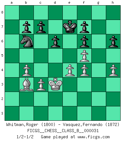 Last move : 1/2-1/2 2008 January 11 9:45:32 [Event "FICGS__CHESS__CLASS_B__000031"] [Site "FICGS"] [Date "2007.10.22"] [Round "1"] [White "Whitman,Roger"] [Black "Vasquez,Fernando"] [Result "1/2-1/2"] [WhiteElo "1800"] [BlackElo "1872"] 1.e4 e5 2.Nf3 d6 3.d4 exd4 4.Nxd4 Nf6 5.Nc3 Be7 6.Bf4 O-O 7.Qd2 Nc6 8.O-O-O Nxd4 9.Qxd4 Be6 10.f3 Nd7 11.Nd5 Bg5 12.g3 Nc5 13.h4 Bxf4+ 14.gxf4 Bxd5 15.Qxd5 Rb8 16.Qd4 Ne6 17.Qd2 Qf6 18.f5 Nc5 19.Qg5 Nd7 20.Bb5 h6 21.Qg3 Nc5 22.Rhg1 a6 23.Bc4 Kh7 24.Rde1 Rfe8 25.Rg2 a5 26.Reg1 Rg8 27.Qg5 Rbf8 28.Qxf6 gxf6 29.a3 Rxg2 30.Rxg2 Na4 31.b4 Nb6 32.Ba2 axb4 33.axb4 Rg8 34.Rxg8 Kxg8 35.Kd2 Kf8 36.f4 Ke7 37.Bb3 Nd7 38.Ke3 Nb6 39.Kd4 Nd7 40.c3 Ke8 41.Ke3 Ke7 42.Kd4 Ke8 43.Ba4 Kd8 44.Ke3 Nb6 45.Bb3 Ke7 46.Kd3 Nd7 47.Ba4 Nb6 48.Bb3 1/2-1/2 Philidor : Exchange variation Kingside Castling by player Black (move 6) Queenside Castling by player White (move 8) This chess game ended in a draw. Follow this game move after move (download)The blunders are all there on the board, waiting to be made. (Savielly Tartakover) Kombinieren und Schwarzhandel gehören verboten. (Savielly Grigorievitsch Tartakower) EL Ajedrez es como la vida. (Boris Spassky) Seul un grand joueur sait à quel point il joue faiblement. (Xavier Tartacover) I'll be back. (Arnold Schwarzenegger)