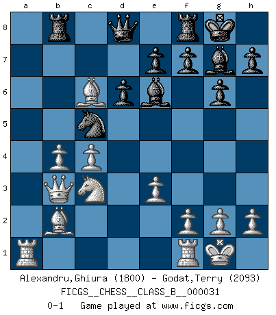 Last move : 0-1 2008 January 16 11:21:48 [Event "FICGS__CHESS__CLASS_B__000031"] [Site "FICGS"] [Date "2007.10.22"] [Round "1"] [White "Alexandru,Ghiura"] [Black "Godat,Terry"] [Result "0-1"] [WhiteElo "1800"] [BlackElo "2093"] 1.d4 Nf6 2.c4 c5 3.e3 g6 4.Nf3 Bg7 5.Be2 O-O 6.O-O cxd4 7.Nxd4 Nc6 8.Nc3 d6 9.a3 Bd7 10.b4 a5 11.Bb2 axb4 12.Nxc6 bxc6 13.axb4 Rb8 14.Qb3 Be6 15.Bf3 Nd7 16.Bxc6 Nc5 0-1 This chess game has been lost on time (started : 2007.10.22 3:19:40) Benoni defense Kingside Castling by player Black (move 5) Kingside Castling by player White (move 6) Player Black won this chess game. Follow this game move after move (download)It is the aim of the modern school, not to treat every position according to one general law, but according to the principle inherent in the position. (Richard Reti) Ich rechne überhaupt nicht voraus. Ich gewinne auch so. (Robert James Fischer) Por esta medida (el intervalo entre Fischer y sus contemporaneos), yo le considero el mas grande campeón mundial. (Garry Kasparov) Le système Elo représente seulement une moyenne. Il est simplement un indicateur de votre stabilité. (Anatoli Karpov) When you stop learning you start dying. (Scott Adams)