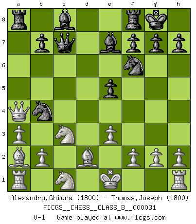 Last move : 0-1 2008 January 16 11:21:48 [Event "FICGS__CHESS__CLASS_B__000031"] [Site "FICGS"] [Date "2007.10.22"] [Round "1"] [White "Alexandru,Ghiura"] [Black "Thomas,Joseph"] [Result "0-1"] [WhiteElo "1800"] [BlackElo "1800"] 1.d4 Nf6 2.Nf3 e6 3.c4 c5 4.e3 cxd4 5.Nxd4 e5 6.Nb3 Bb4+ 7.Bd2 a5 8.a3 Be7 9.Nc3 O-O 10.Bd3 d5 11.Qc2 dxc4 12.Bxc4 a4 13.Nc1 Qc7 14.Ba2 Na6 15.Qxa4 Nb4 0-1 This chess game has been lost on time (started : 2007.10.22 3:19:40) Queen's pawn game Kingside Castling by player Black (move 9) Player Black won this chess game. Follow this game move after move (download)If you aren't afraid of Spassky, then I have removed the element of money. (Jim Slater) Wenn sie aufgeben, dann danke ich Ihnen für das Spiel (Eventualzug beim Fernschach). (Anonymous) Debemos de asegurarnos de que el Ajedrez no se convierta en un lenguaje muerto, muy interesante, pero tan solo para un grupo muy pequeño. (Sytze Faber) Les échecs sont plus proches de l'art de l'assassinat que de l'art de la guerre. (Arturo Perez-Reverte) It's only after you lost everything, Tyler says, that you're free to do anything. (Chuck Palahniuk, Fight Club)