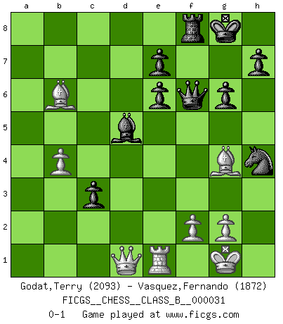 Last move : 0-1 2007 December 9 5:10:18 [Event "FICGS__CHESS__CLASS_B__000031"] [Site "FICGS"] [Date "2007.10.22"] [Round "1"] [White "Godat,Terry"] [Black "Vasquez,Fernando"] [Result "0-1"] [WhiteElo "2093"] [BlackElo "1872"] 1.d4 d5 2.c4 dxc4 3.Nf3 Nf6 4.Nc3 a6 5.e4 b5 6.e5 Nd5 7.a4 Nxc3 8.bxc3 Bb7 9.e6 fxe6 10.Be2 Qd5 11.Bf4 Nd7 12.O-O g6 13.axb5 axb5 14.Rxa8+ Bxa8 15.Bxc7 Bg7 16.Re1 O-O 17.Bg3 Nf6 18.Qd2 Ne4 19.Qe3 Qf5 20.Bc7 Bd5 21.Bd1 Nd6 22.h4 Qd3 23.Qc1 b4 24.cxb4 Bxd4 25.Nxd4 Qxd4 26.Qe3 Qxh4 27.Bb6 Nf5 28.Qd2 Qf6 29.Bg4 c3 30.Qd1 Nh4 0-1 QGA, Bogolyubov variation Kingside Castling by player White (move 12) Kingside Castling by player Black (move 16) Player Black won this chess game. Follow this game move after move (download)After black's reply to 1.e4 with 1..e5, leaves him always trying to get into the game. (Howard Staunton) Jeder leidlich begabte Spieler, er braucht keineswegs hervorragend veranlagt zu sein, kann es zum Meister bringen. Aber das ist ja auch gar nicht nötig! Der richtige Standpunkt ist es, zu seinem Vergnügen zu spielen, und man glaube ja nicht, dass der Genuss proportional dem Können sei. (Siegbert Tarrasch) Buenas posiciones no logran ganar juegos, buenas movidas sí. (Gerald Abrahams) Les échecs, c'est l'art d'analyser. (Mikhail Botvinnik) They say in chess you've got to kill the queen, and then you mate it... Oh I, do you ? (Red Hot Chili Peppers, Fortune faded)