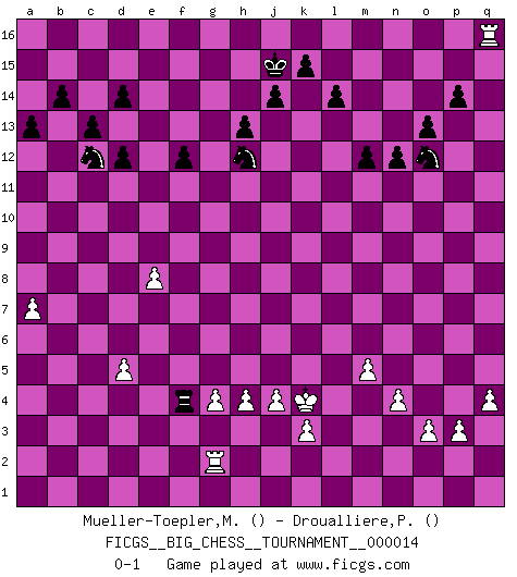 Last move : 0-1 2007 November 9 18:54:19 [Event "FICGS__BIG_CHESS__TOURNAMENT__000014"] [Site "FICGS"] [Date "2007.10.23"] [Round "1"] [White "Mueller-Toepler,Michael"] [Black "Droualliere,Philippe"] [Result "0-1"] [WhiteElo ""] [BlackElo ""] 1.k1-l3 g15-g13 2.g2-g4 n15-n13 3.p2-p3 o16-g9 4.n2-n3 h16-f14 5.h1-f3 f14-c14 6.o2-o3 g16-f14 7.b1-a3 g9-a3 8.b2-a3 c14-c2 9.e2-e4 m15-m13 10.g1-e2 c2-c10 11.k2-k3 l16-n14 12.h3-h4 h14-h13 13.c1-b2 k16-l14 14.o1-p2 m13-m12 15.a1-c1 c10-d9 16.f3-c3 f16-l11 17.c3-c2 l11-b2 18.c2-b2 b16-c14 19.d2-d4 d9-f7 20.f2-f3 f7-a2 21.b2-a2 n14-a2 22.e2-c3 a2-h9 23.m2-m3 b15-b14 24.m3-m4 c16-b15 25.m4-m5 c14-d12 26.e4-e5 o15-o13 27.f1-d3 n13-n12 28.n3-n4 p16-o14 29.p1-q3 e15-e13 30.f3-f4 j15-k13 31.j2-k4 f14-g12 32.l1-o4 f15-f13 33.o4-n3 c15-c13 34.c3-b5 l14-k12 35.d3-c4 e16-e14 36.f4-f5 m16-m14 37.c4-h9 b15-h9 38.e5-e6 m14-l14 39.k4-j2 q16-m16 40.j3-j4 m16-m13 41.n3-g9 k12-h11 42.g9-d12 e13-d12 43.d4-d5 m13-l13 44.h2-k1 e14-e10 45.p2-o1 e10-l10 46.o1-d11 g12-e11 47.b5-c7 h11-f10 48.d11-b13 d15-d14 49.b13-l4 h9-g8 50.l4-o1 a16-e16 51.a3-a4 l10-g10 52.e1-g1 e11-f9 53.f5-f6 f9-d8 54.a4-a5 g8-e10 55.o1-e10 e16-e10 56.e6-e7 d8-b7 57.a5-a6 b7-d6 58.k1-h2 f10-e8 59.c7-e8 d6-e8 60.g1-f1 l13-l3 61.j2-l3 l14-l3 62.f6-f7 e8-d6 63.j1-k2 g10-l10 64.e7-e8 l3-l2 65.k2-j3 e10-f10 66.c1-c6 d6-f7 67.c6-f6 l2-l7 68.m1-l1 l7-l1 69.q1-l1 l10-l1 70.f1-l1 f10-q10 71.f6-f7 q10-q3 72.l1-l2 f13-f12 73.f7-a7 q3-q8 74.a7-p7 p15-p14 75.p7-e7 h15-f14 76.q2-q4 f14-d13 77.h2-f3 q8-q6 78.a6-a7 q6-a6 79.f3-g5 a6-a3 80.j3-k4 l15-l14 81.g5-e6 a3-d3 82.e6-f4 d3-g3 83.e7-g7 g3-f3 84.g7-g13 d13-e11 85.g13-g15 f3-f4 86.l2-g2 a15-a13 87.g15-g14 e11-c12 88.g14-g16 j16-h15 89.g16-o16 o14-m13 90.o16-o15 h15-j15 91.o15-q15 m13-o12 92.q15-q16 k13-h12 0-1 Follow this game move after move (download)It is always better to sacrifice your opponent's men. (Savielly Tartakower) Aljechin war kein Nazi. Er war ein Opportunist. Ein schrecklicher Mann. Er liebte Geld über alles und würde für Geld ein Jude, ein Katolik oder ein Protestant werden. (Miguel Najdorf) Cuando veas una buena jugada, trata de encontrar otra mejor. (Emanuel Lasker) Vous savez, camarade Pachman, je n'éprouve pas de plaisir à être ministre, je jouerais plutôt aux échecs comme vous, ou alors ferais une révolution au Venezuela. (Che Guevara à Ludek Pachman, 'Checkmate in Prague', 1975) Creativity is allowing yourself to make mistakes. Art is knowing which ones to keep. (Scott Adams)