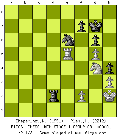 Last move : 1/2-1/2 2006 September 11 12:6:34 [Event "FICGS__CHESS__WCH_STAGE_1_GROUP_08__000001"] [Site "FICGS"] [Date "2006.07.01"] [Round "1"] [White "Cheparinov,Nedelcho"] [Black "Plant,Kevin D."] [Result "1/2-1/2"] [WhiteElo "1951"] [BlackElo "2212"] 1.e4 e5 2.Nf3 Nc6 3.Bb5 a6 4.Ba4 d6 5.Bxc6+ bxc6 6.d4 exd4 7.Qxd4 c5 8.Qd3 Nf6 9.O-O Be7 10.e5 dxe5 11.Qxd8+ Bxd8 12.Nxe5 Nd5 13.Na3 Be6 14.Re1 O-O 15.Bd2 Bf6 16.Ba5 Rfd8 17.Nac4 Nb4 18.Re2 Rd4 19.Rae1 Re8 20.h3 h5 21.b3 Bxc4 22.Nxc4 Rxe2 23.Rxe2 Rd1+ 24.Kh2 Nxa2 25.Bxc7 Nb4 26.Be5 Bxe5+ 27.Rxe5 Nxc2 28.Rxc5 Nd4 29.Ra5 Nxb3 30.Rxa6 Rd4 31.Ne3 g6 32.g4 h4 33.Ra2 Nc5 34.g5 Ne6 35.Ra5 Rd2 36.Ng4 Kg7 37.Re5 1/2-1/2 Ruy Lopez : Modern Steinitz defense, Richter variation Kingside Castling by player White (move 9) Kingside Castling by player Black (move 14) This chess game ended in a draw. Follow this game move after move (download)After a bad opening, there is hope for the middle game. After a bad middle game, there is hope for the endgame. But once you are in the endgame, the moment of truth has arrived. (Edmar Mednis) Schach ist Kampf, hauptsächlich jedoch gegen die eigenen Fehler. (Savielly Grigorievitsch Tartakower) Con el fin de mejorar tu juego, debes de estudiar los finales antes que todo, ya que mientras que los finales pueden ser estudiados y dominados por sí mismos, el juegomedio y la apertura deben de ser estudiados en relación con los finales. (José Raúl Capablanca) Les Echecs mettent en conflit, non pas deux intelligences, mais deux volontés. (Lasker) Computer Science is no more about computers than astronomy is about telescopes. (Edsger W. Dijkstra)