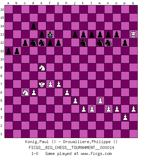 Last move : 1-0 2008 May 15 22:0:29 [Event "FICGS__BIG_CHESS__TOURNAMENT__000014"] [Site "FICGS"] [Date "2007.10.23"] [Round "1"] [White "Konig,Paul"] [Black "Droualliere,Philippe"] [Result "1-0"] [WhiteElo ""] [BlackElo ""] 1.g2-g4 g15-g13 2.f2-f4 b15-b14 3.e2-e4 c16-b15 4.d2-d4 f15-f13 5.m2-m3 h16-a9 6.p1-o3 n15-n13 7.g1-e2 m15-m13 8.h1-f3 l16-o13 9.b2-b3 e15-e13 10.c2-c4 a9-d9 11.j3-j4 f16-c13 12.n2-n3 o16-b4 13.c1-d2 b4-g9 14.d2-c3 k16-l14 15.e2-g3 p16-o14 16.f1-d3 g9-k6 17.h3-h4 k6-h8 18.e4-e5 o13-d3 19.f3-d3 e16-e14 20.b1-d2 d9-l9 21.l2-l3 e14-d14 22.d3-f5 b15-e12 23.d2-e4 g16-f14 24.f5-f7 b16-c14 25.a1-d1 d14-d10 26.f4-f5 e12-c10 27.f7-p7 q16-p16 28.c3-d2 l9-h12 29.d2-h6 d10-j10 30.g4-g5 h12-j13 31.p7-j13 h15-j13 32.k2-k3 l14-m12 33.f5-f6 m16-m14 34.g3-f5 m14-k14 35.f5-g7 p16-m16 36.h4-h5 c10-d11 37.m3-m4 d11-o1 38.q1-o1 m16-m14 39.l1-m2 k14-k7 40.k1-j3 m14-k14 41.g7-f9 h8-f10 42.k3-k4 f10-j7 43.h6-j7 c13-j7 44.h5-h6 j7-g9 45.m1-k1 f14-g12 46.f9-g11 j10-p10 47.p2-p3 j16-h15 48.o3-n5 a16-f16 49.h2-g4 k14-k9 50.n5-l6 g9-b4 51.e1-e2 h14-h13 52.l6-m8 k7-k8 53.m8-k9 k8-k9 54.n3-n4 f13-f12 55.g11-h13 j15-h13 56.j2-g3 f16-f14 57.g3-h5 f14-d14 58.d4-d5 p10-g10 59.g5-g6 g12-f10 60.j4-j5 f10-h9 61.g6-g7 j13-k11 62.o2-o4 h9-k8 63.l3-l4 k8-l6 64.m4-m5 l6-k8 65.a2-a3 b4-a3 66.d1-b1 g10-b10 67.e2-e3 k9-b9 68.j3-g2 c14-d12 69.k1-k3 d14-c14 70.e3-c3 a3-b4 71.c3-d3 k11-j9 72.m2-l1 b4-j11 73.l1-g5 k8-h7 74.g5-h4 c14-c4 75.e4-f2 j11-c5 76.j1-h2 c4-d4 77.d3-d4 c5-d4 78.o1-d1 d4-a7 79.f2-e4 b9-b4 80.b1-a1 b4-e4 81.f6-f7 b10-b7 82.k3-g3 a15-a13 83.h5-f6 h7-f6 84.e5-f6 b7-f7 85.h2-h3 h13-g11 86.d1-e1 e4-e1 87.a1-e1 d15-d14 88.g4-e5 f7-b7 89.e1-c1 c15-c13 90.e5-c6 a7-f2 91.g3-f3 f2-h4 92.h3-h4 h15-g14 93.f3-f2 b7-b3 94.g2-j3 k15-k13 95.f2-f4 b3-b2 96.f4-b4 b2-b4 97.c6-b4 l15-l13 98.j3-h5 b14-b13 99.f6-f7 o14-n12 100.c1-c9 j9-h11 101.h5-f6 o15-o13 102.c9-q9 q15-q14 103.h4-g5 b13-b12 104.g5-f5 j14-j13 105.f5-e6 a13-a12 106.q9-p9 p15-p13 107.p9-q9 g14-f13 108.q9-q14 g11-e12 109.b4-c6 h11-k12 110.f6-g8 a12-a11 111.d5-d6 p13-p12 112.q14-q13 c13-c12 113.q2-q4 b12-b11 114.g8-e9 g13-g12 115.e6-e7 1-0 Follow this game move after move (download)I won't play with you anymore. You have insulted my friend. - When an opponent cursed himself for a blunder. (Miguel Najdorf) Schach ist ein Teil der Kultur, und wenn es mit der Kultur abwärts geht, geht es auch mit dem Schach abwärts. (Mikhail Moiseyevich Botvinik) Yo no creo en la psicología. Yo creo en las buenas movidas. (Bobby Fischer) Que feriez-vous si vous étiez en train de jouer aux échecs et que la fin du monde arrive ? Je continuerais à jouer. (Saint Borromée) He who laughs last probably does not get the joke. (Unknown)
